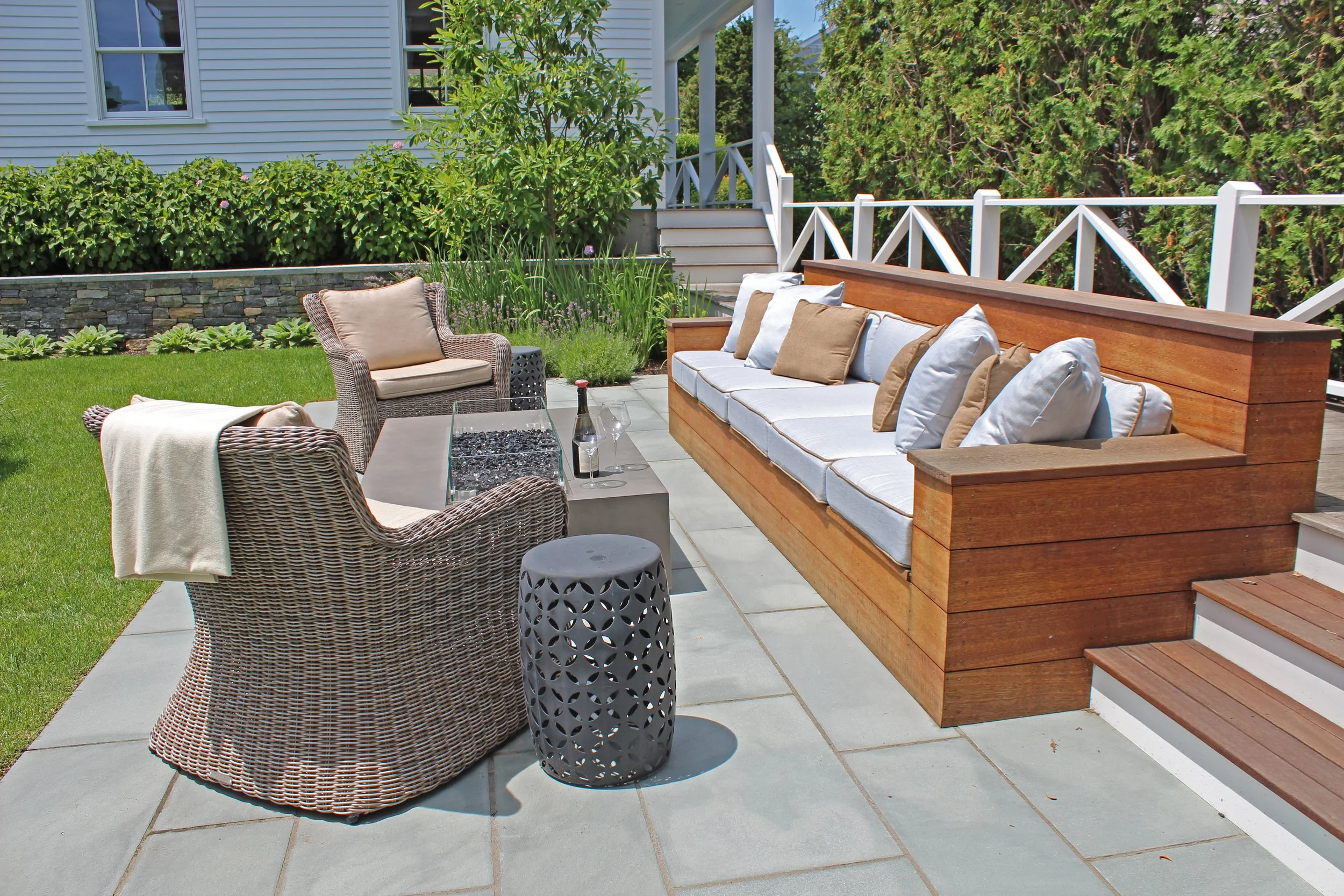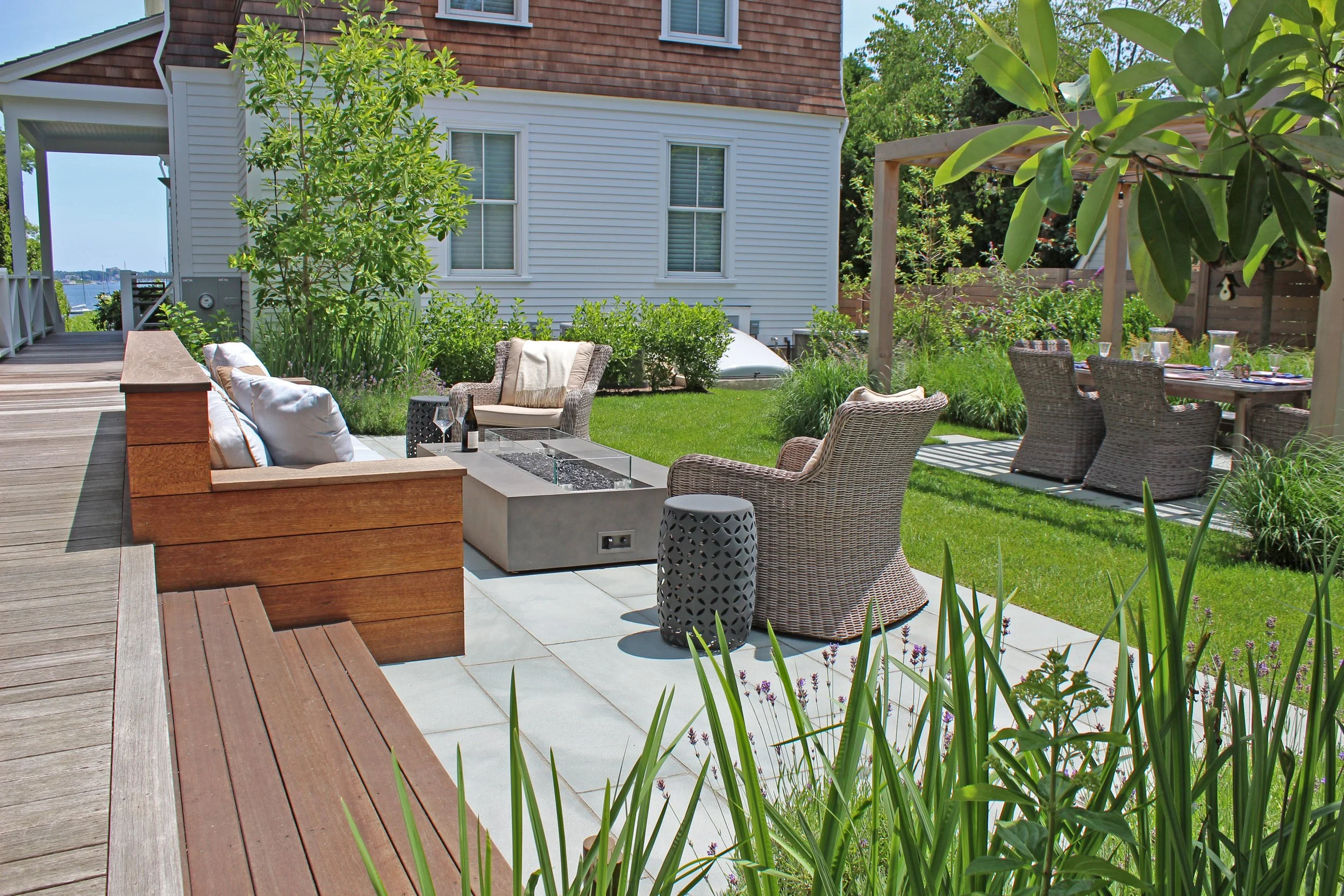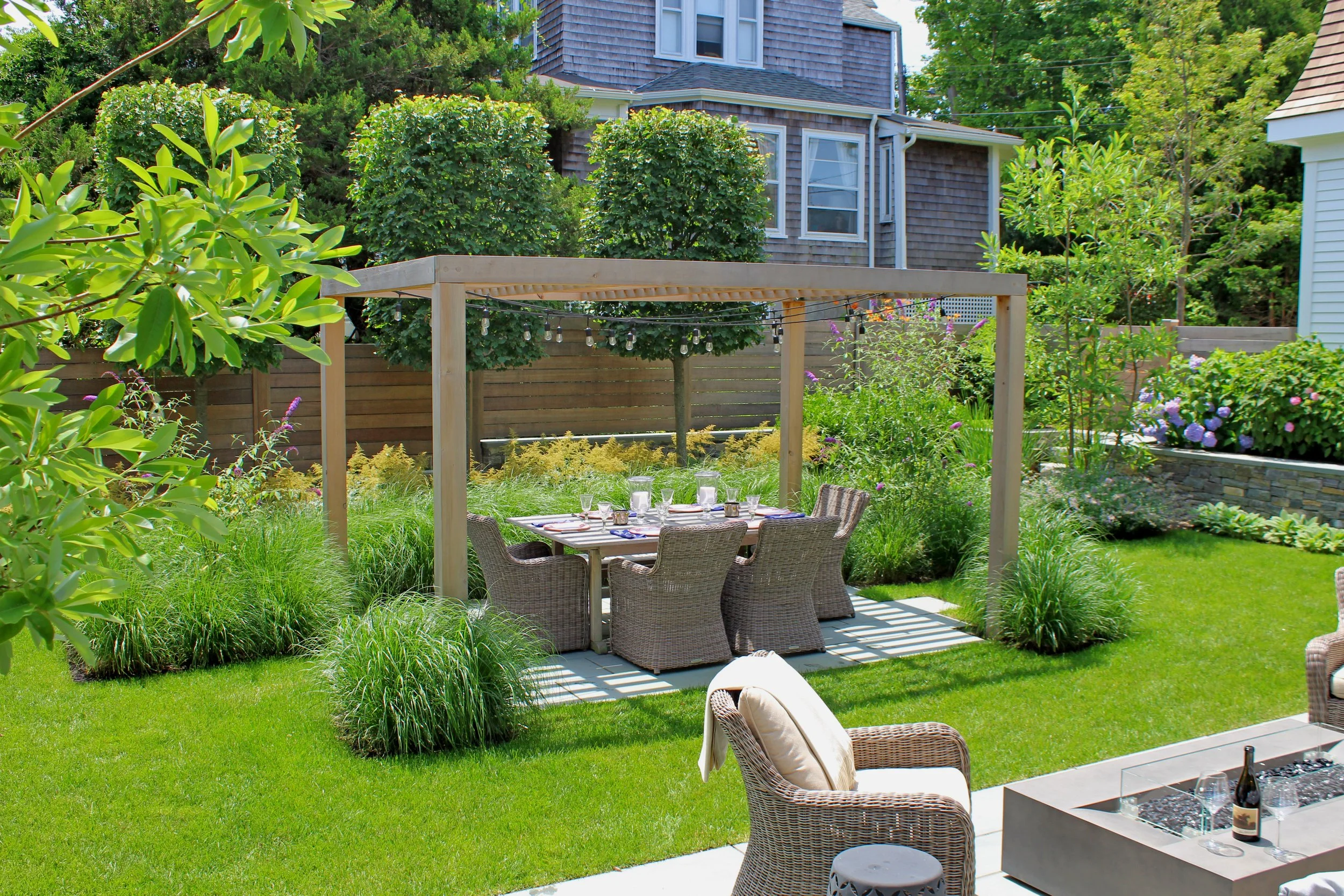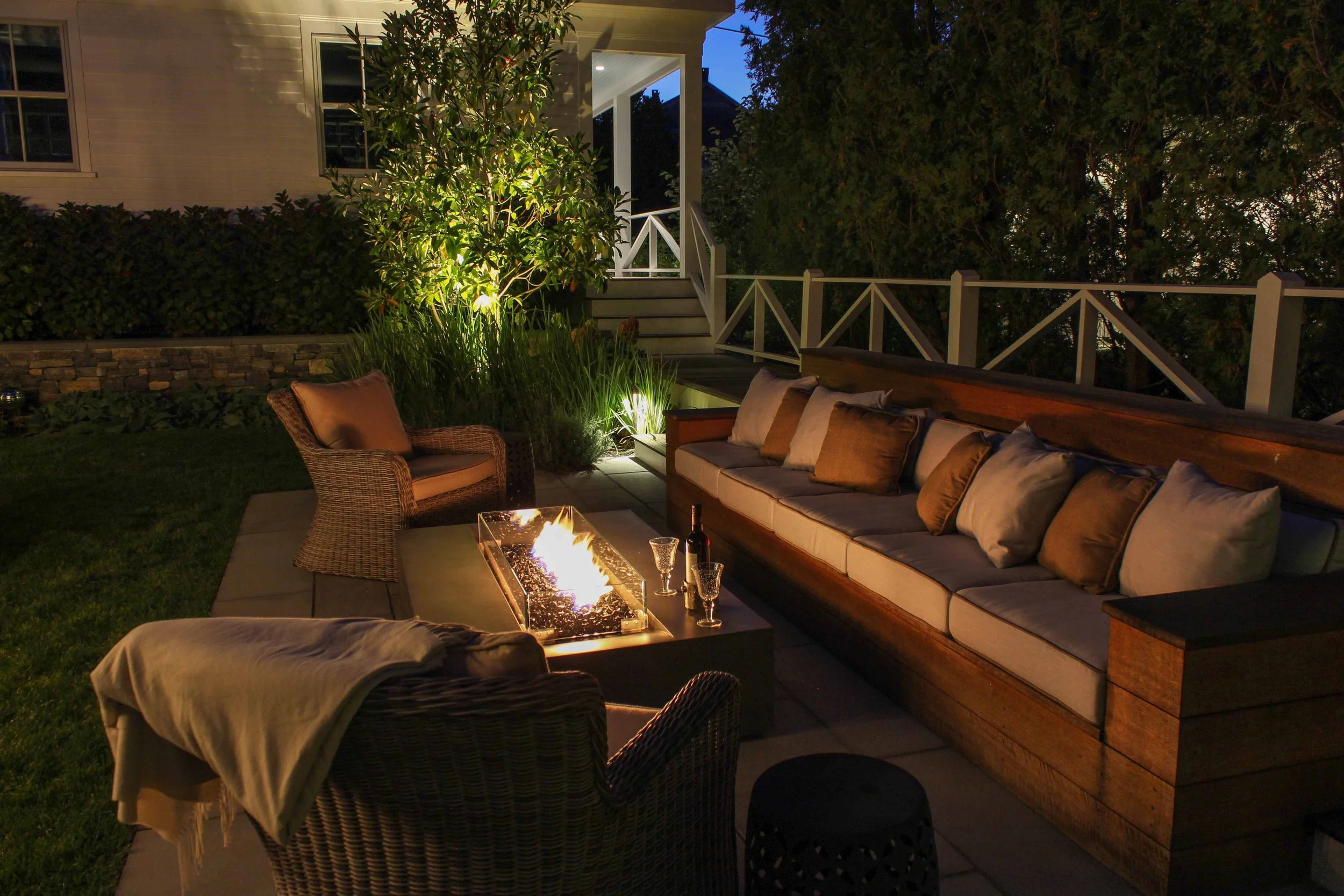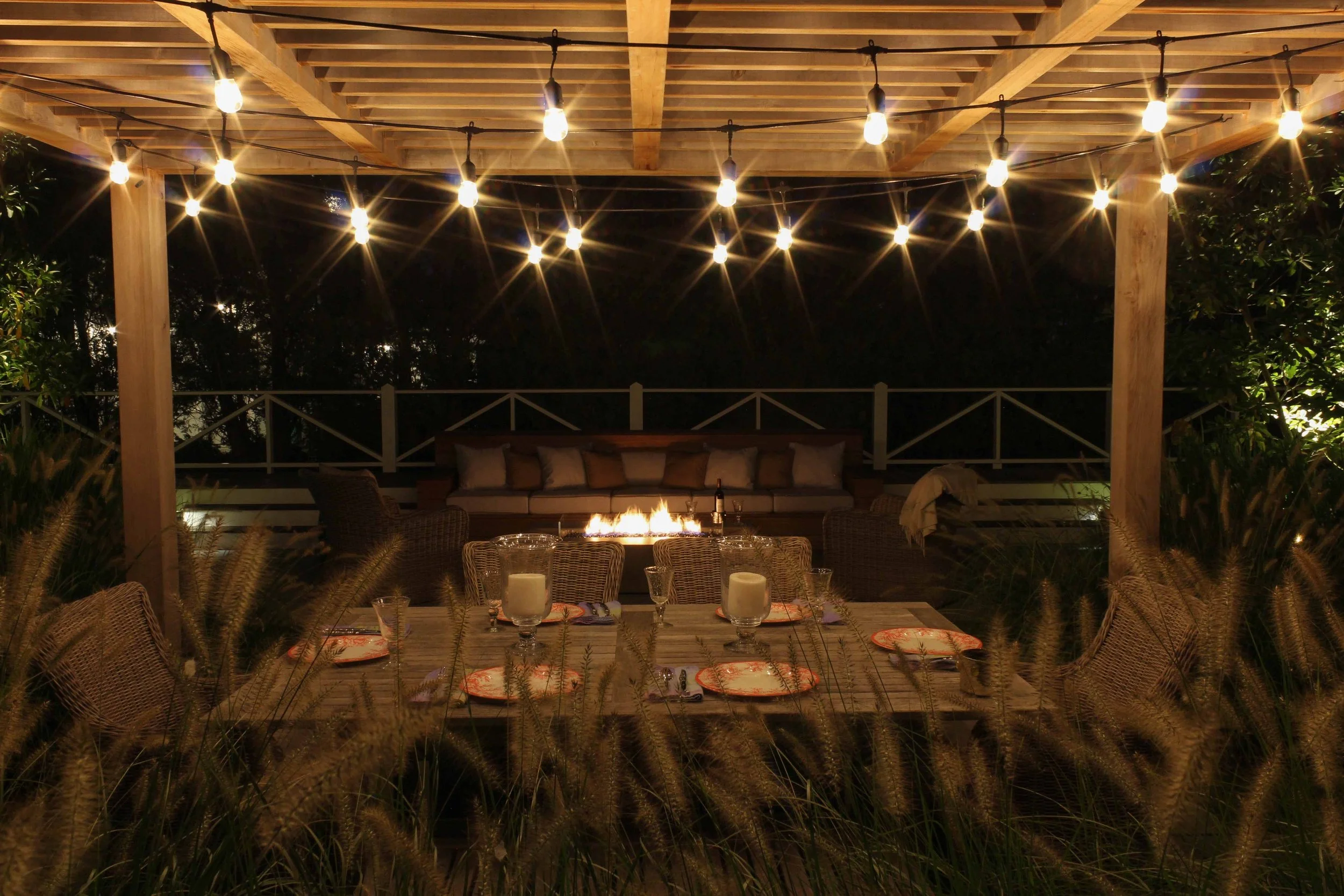 A key feature to this design was a custom built-in banquette seating area with a gas fire pit to enjoy well into the cooler months. There is also a custom pergola highlighted with string catenary lights over the dining table.