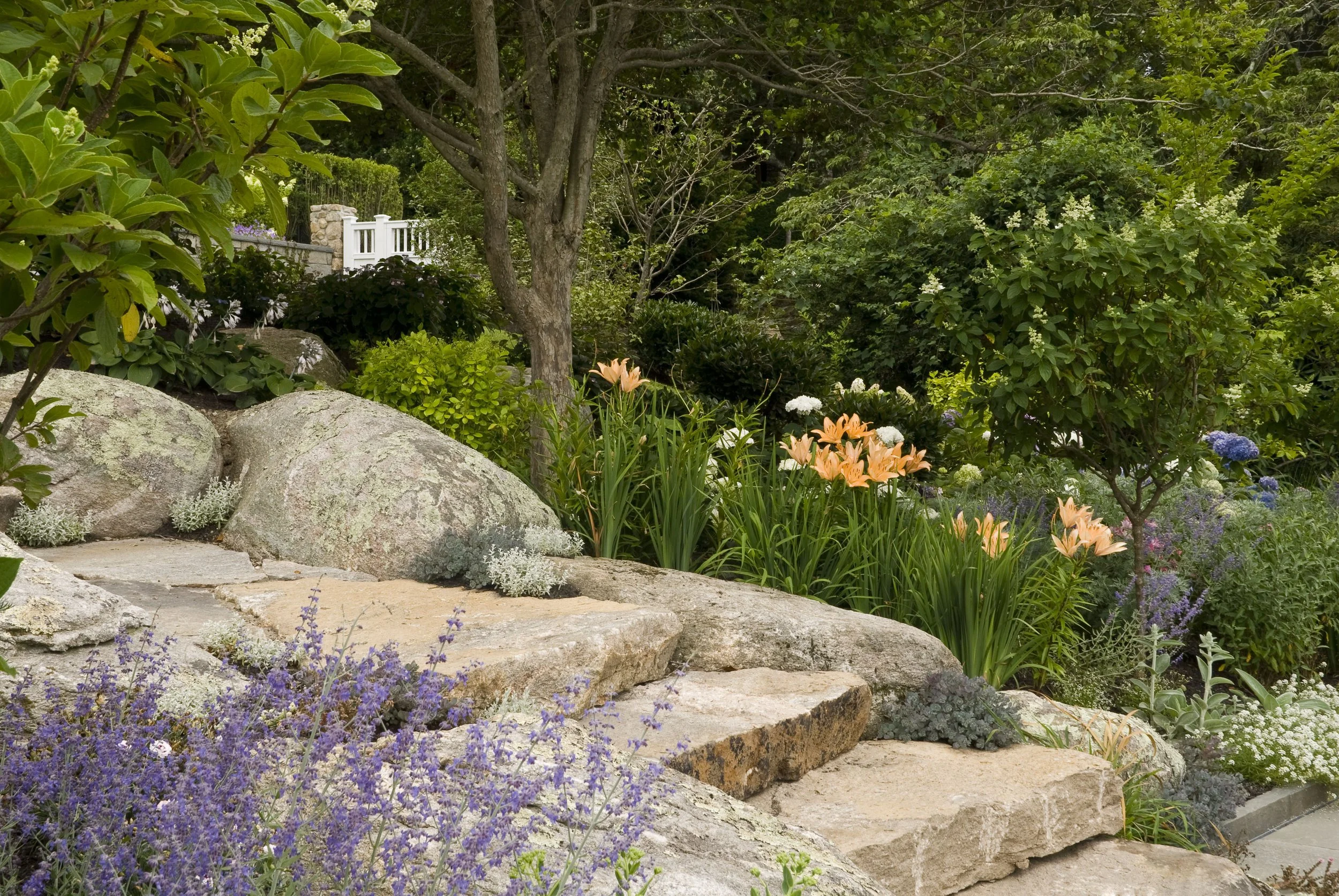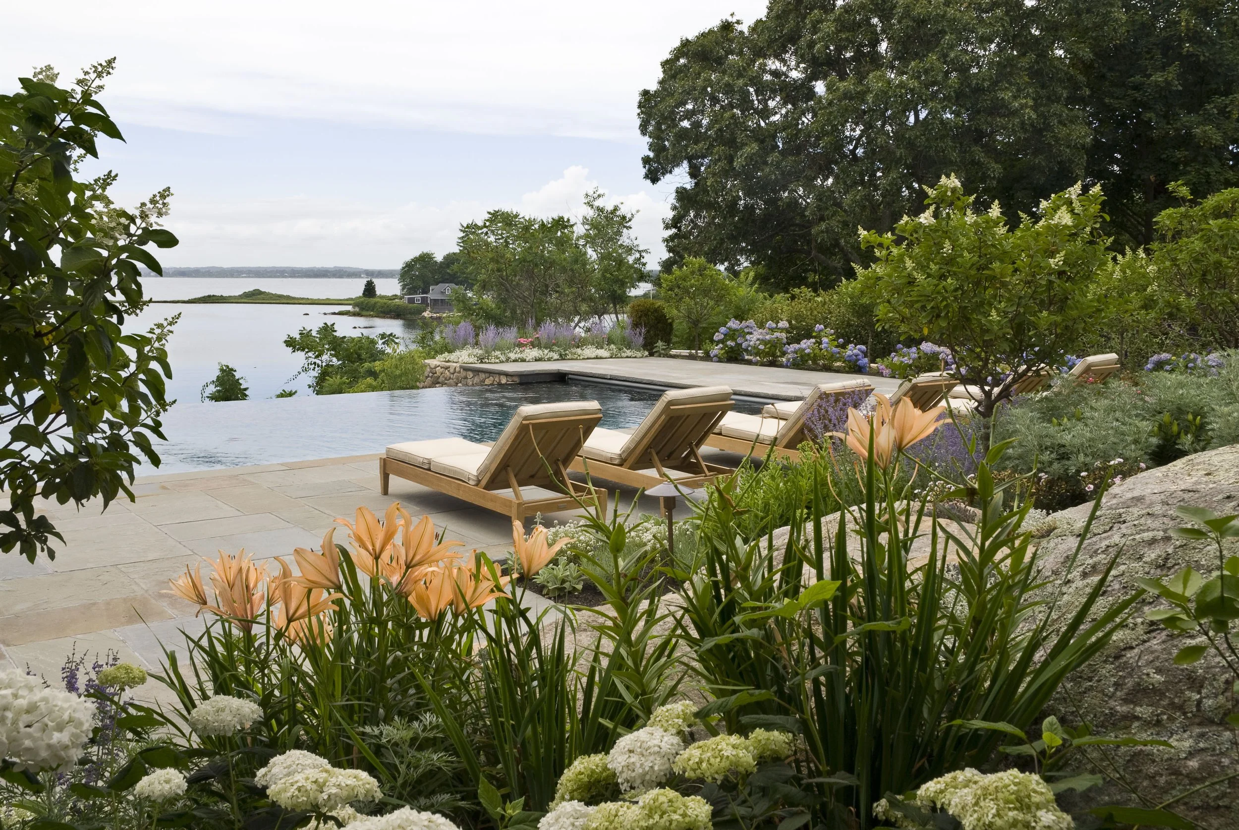 The clients wanted to retain a natural look for this landscape that would blend seamlessly with the quiet cove below. The design incorporates existing rock outcroppings, and extends this theme through the use of additional boulders and fieldstone slabs as steps from the house to the mezzanine pool location, and finally to the dock below. With the focus on the summer season, plantings frame the pool area to create privacy and separate the terrace from a simple play lawn next to the house. As in all our projects, we include native and flowering species that can be gathered for colorful arrangements.
