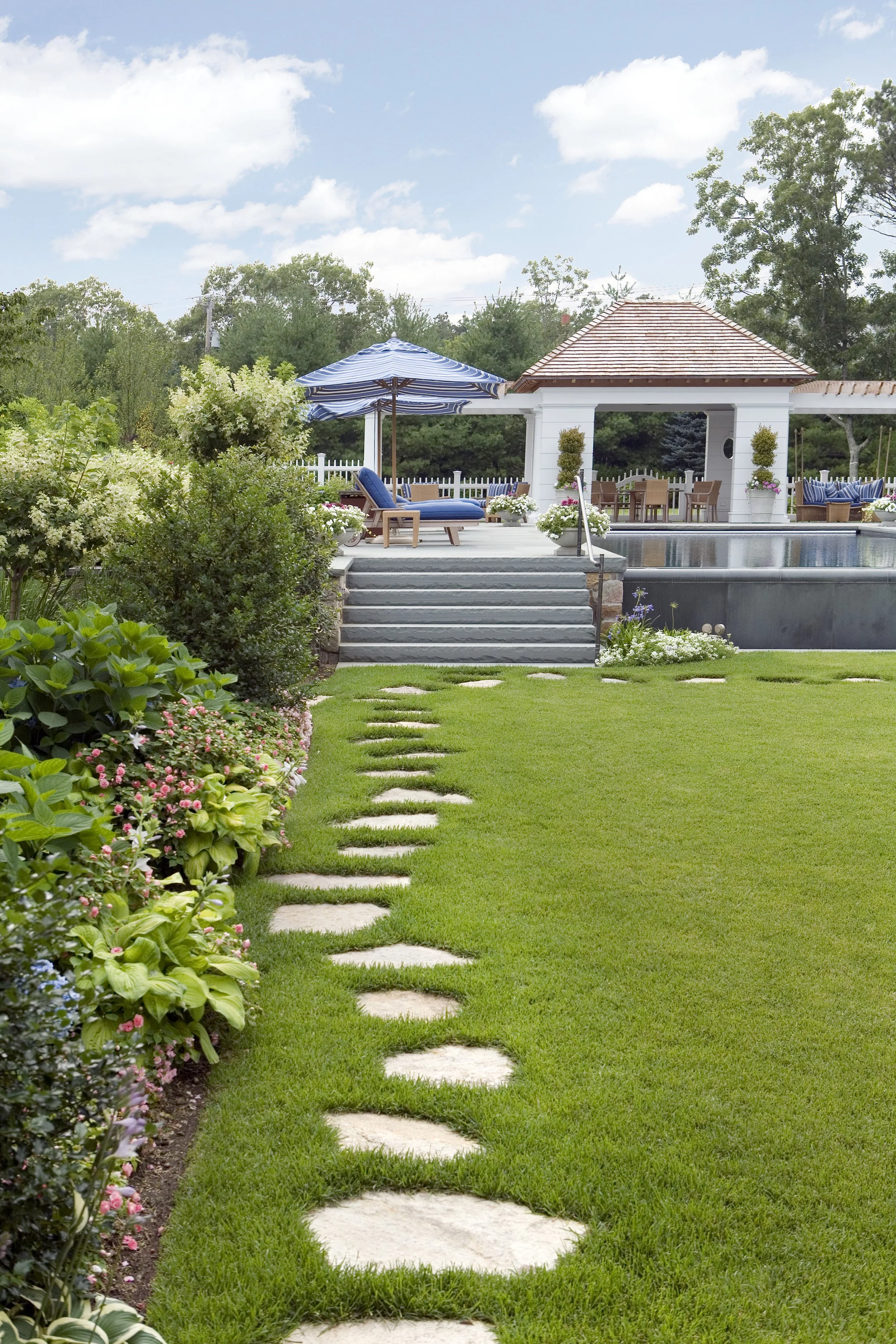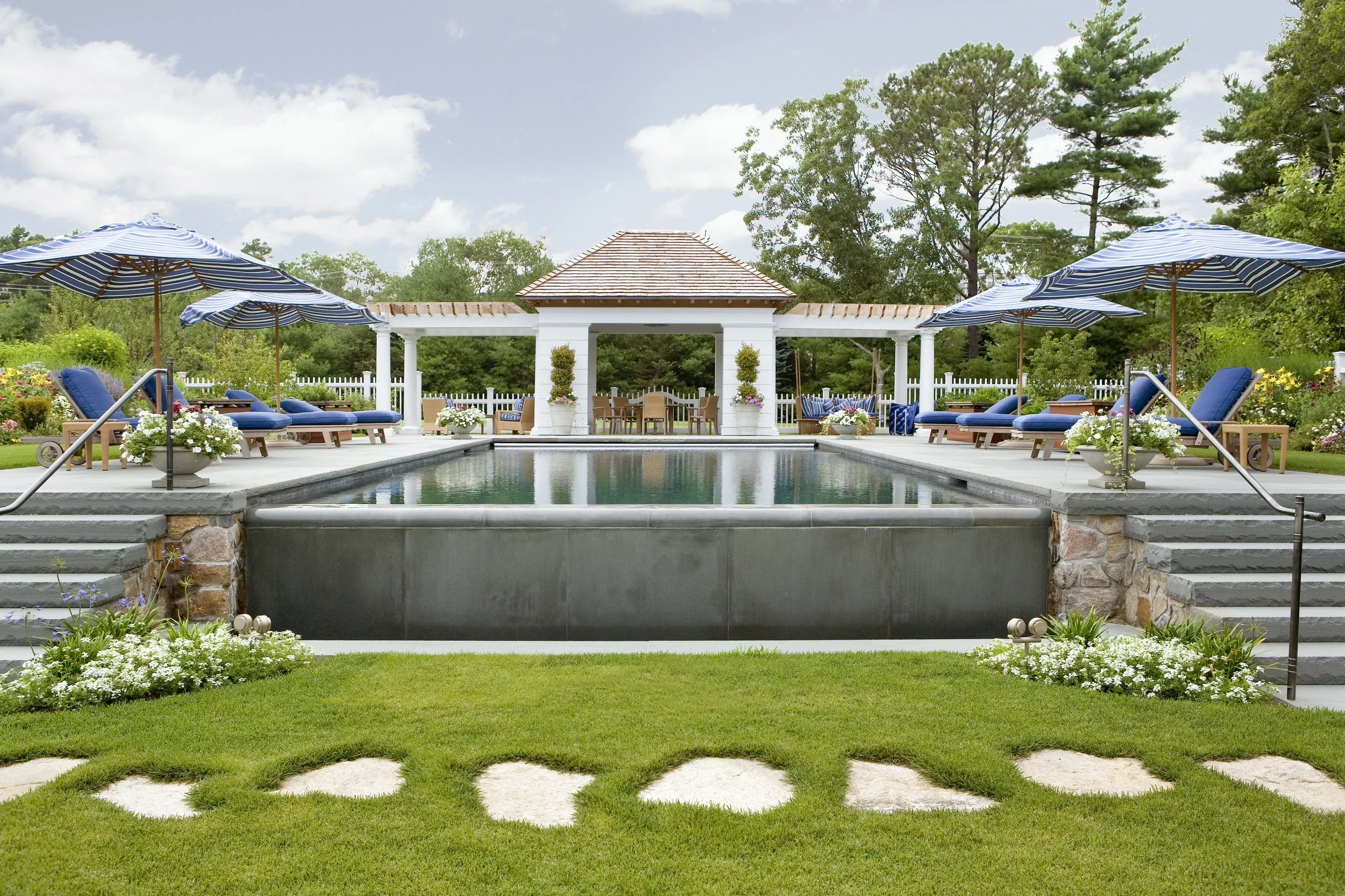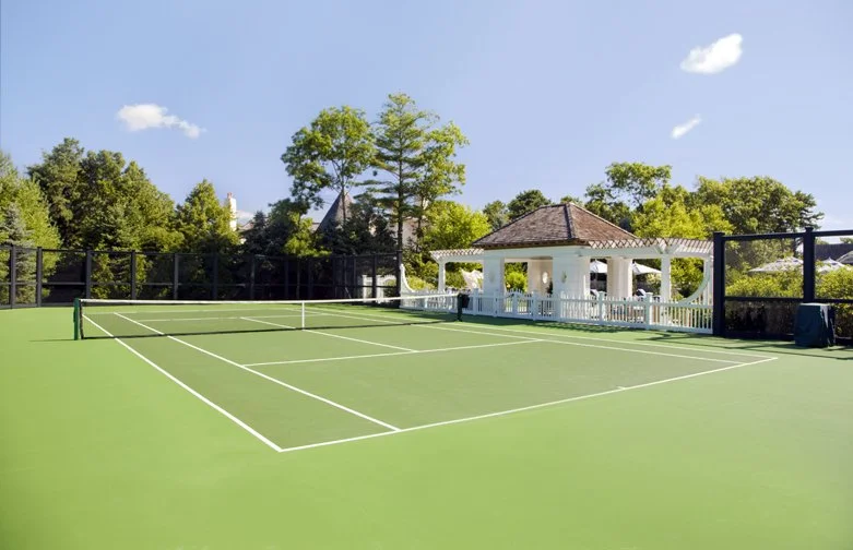The master plan included siting a new pool house, guest house, outdoor shower and tennis court. The design includes custom wood fencing for pool and tennis court enclosure, and bronze handrails.