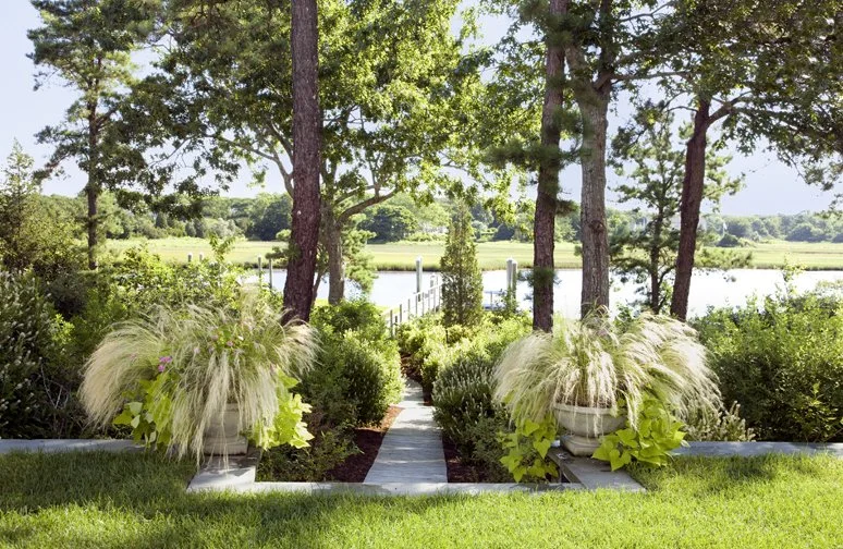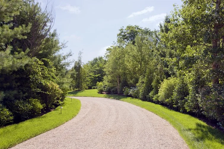 The driveway was relocated to expand the interior usable space, provide complete privacy from the road, and create an arrival sequence that reveals the house on axis. The graceful curves of the drive are planted with large evergreens and an understory combination of hydrangeas, clethra, hollies, leucothoe and rhododendrons. A gravel surface allows for rainwater infiltration and a graceful, soft passage into the private retreat.