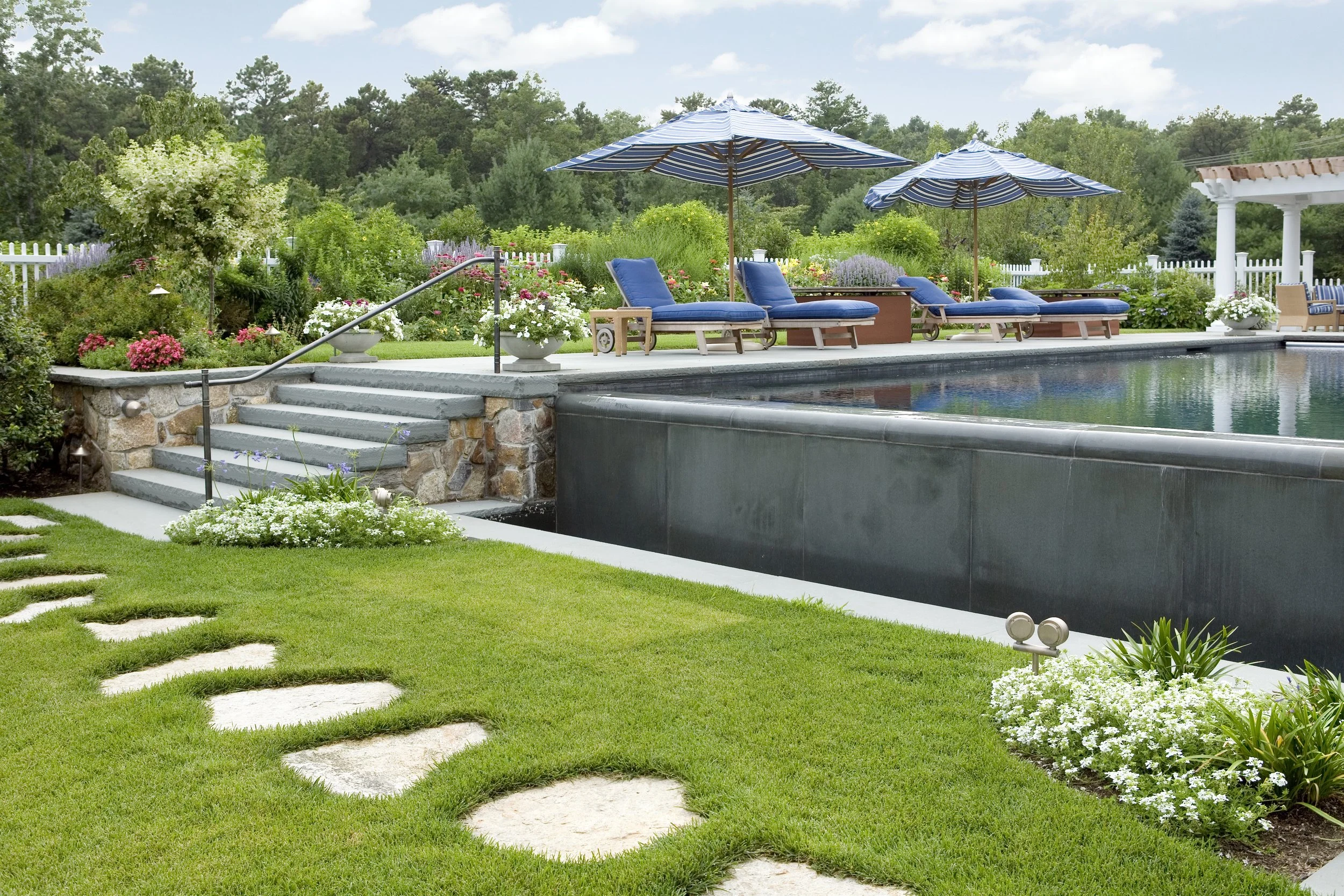 Planting includes the revegetation of the coastal buffer, property line screening, a perennial garden flanking the pool terraces, summer flowering borders and roses for the pool house pergolas.