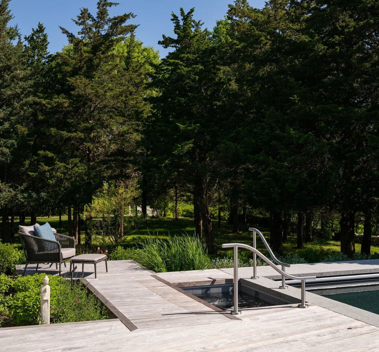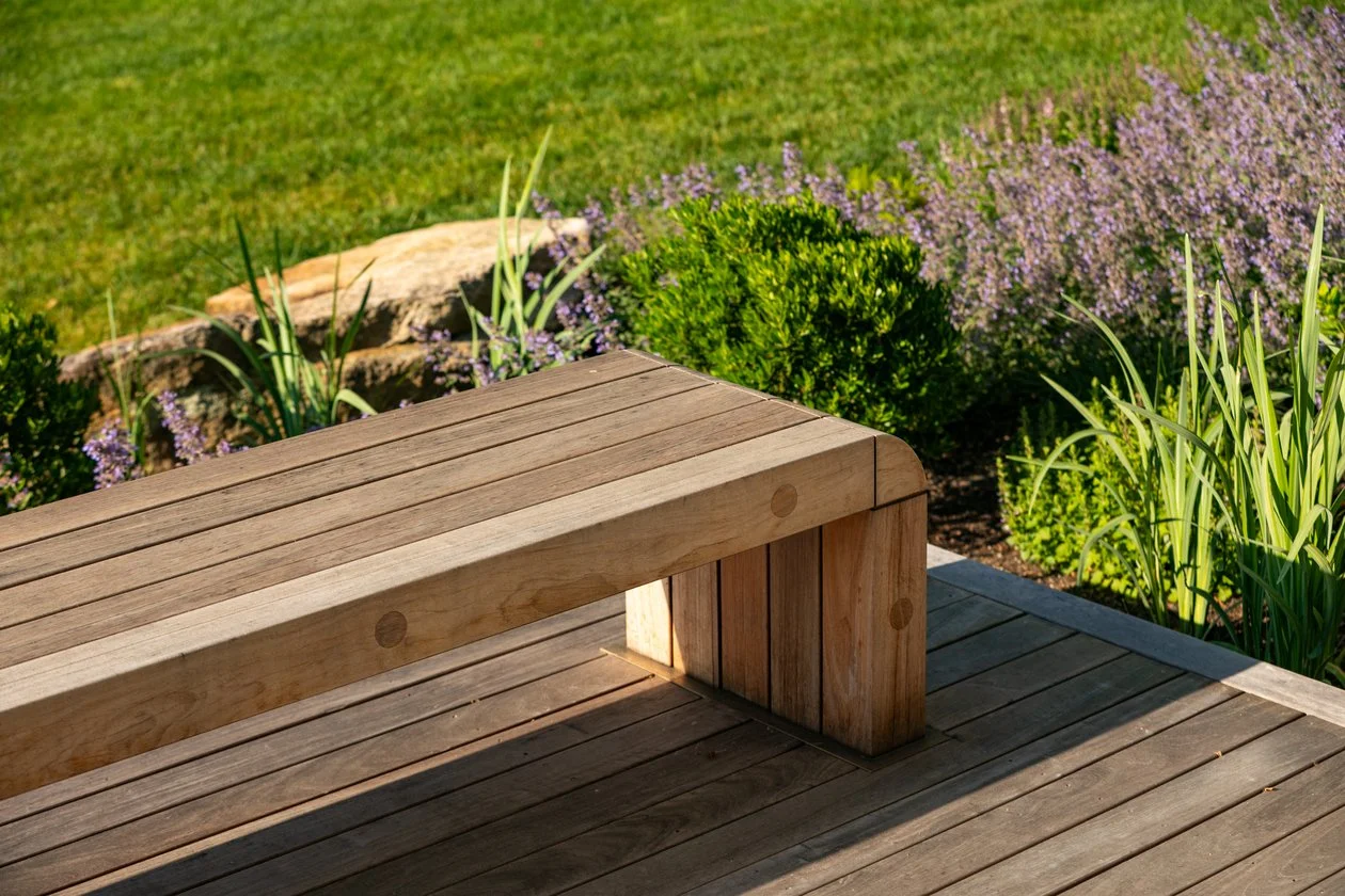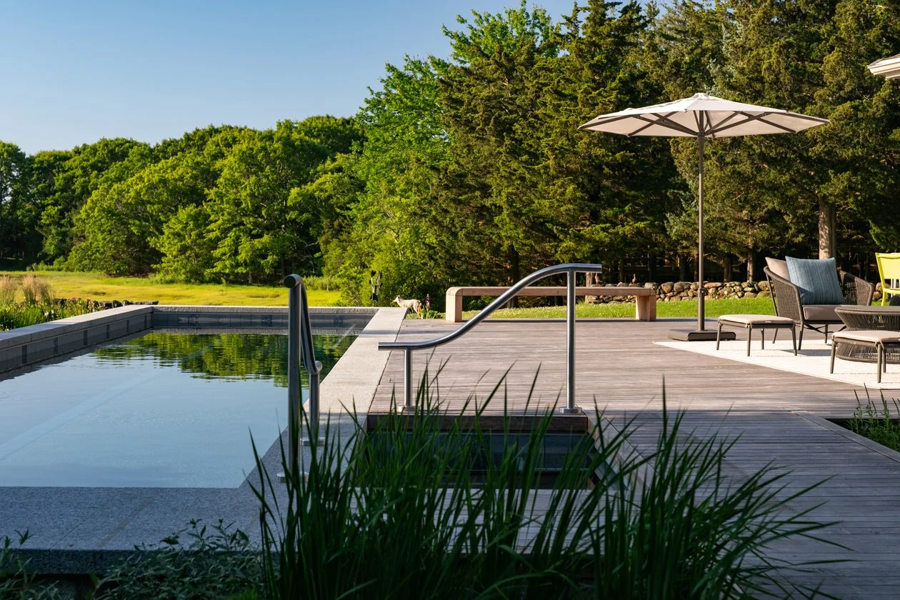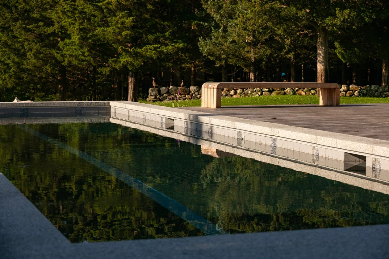 Because the pool had to rise out of grade to meet the deck’s elevation, we carefully sourced a veneer stone that echoed the texture and tone of the property’s existing stone walls. This allowed for a natural visual transition between old and new elements. The deck itself was reimagined with custom bench seating that appears to peel or fold organically from the deck surface - softening the geometry of the space while offering sculptural function.
