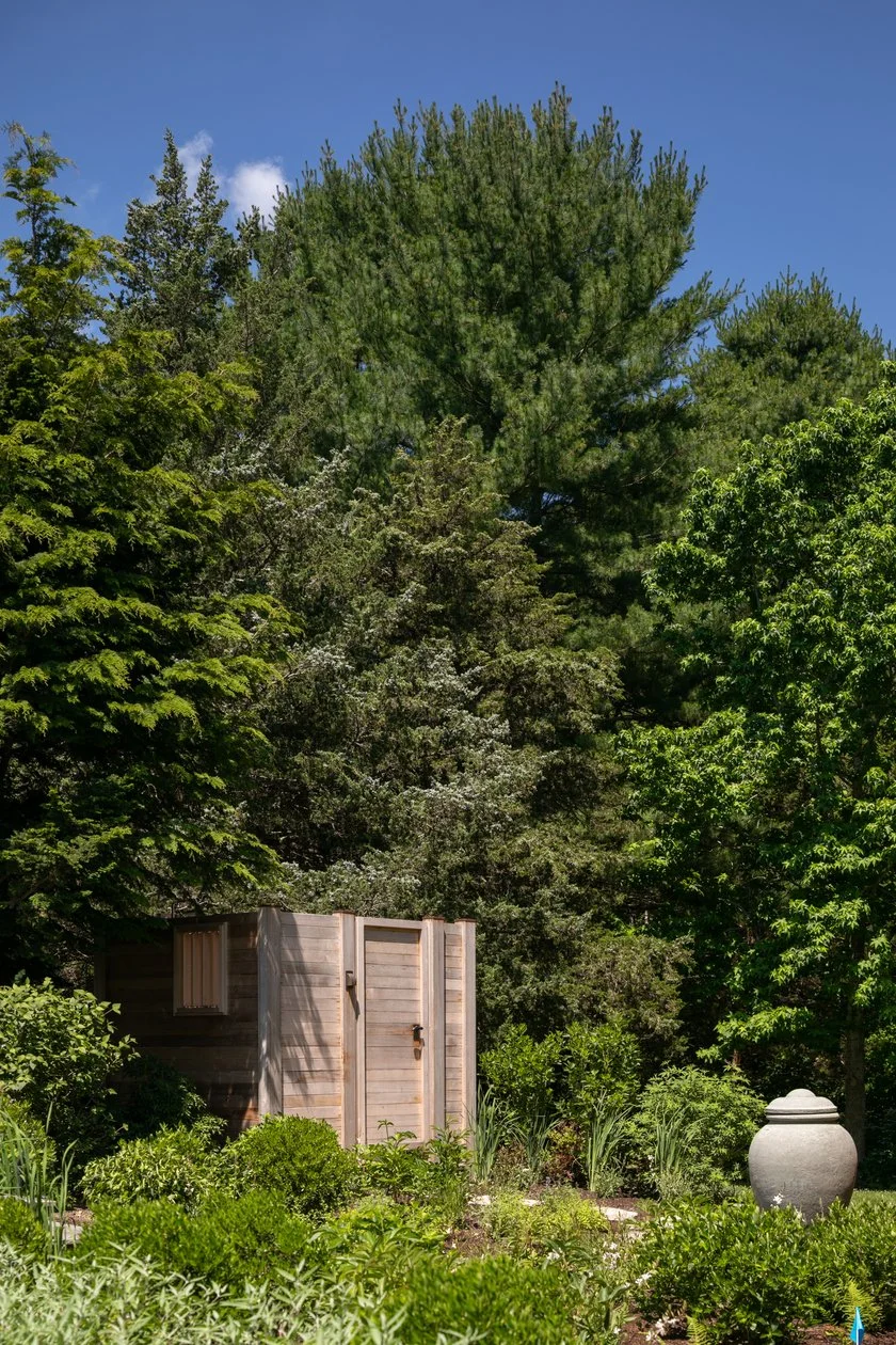 Privacy and openness were equally important to the outdoor shower experience. Our team developed a custom louvered enclosure that can be opened to embrace the expansive marsh views or closed for full privacy - an elegant solution that balances exposure and seclusion.