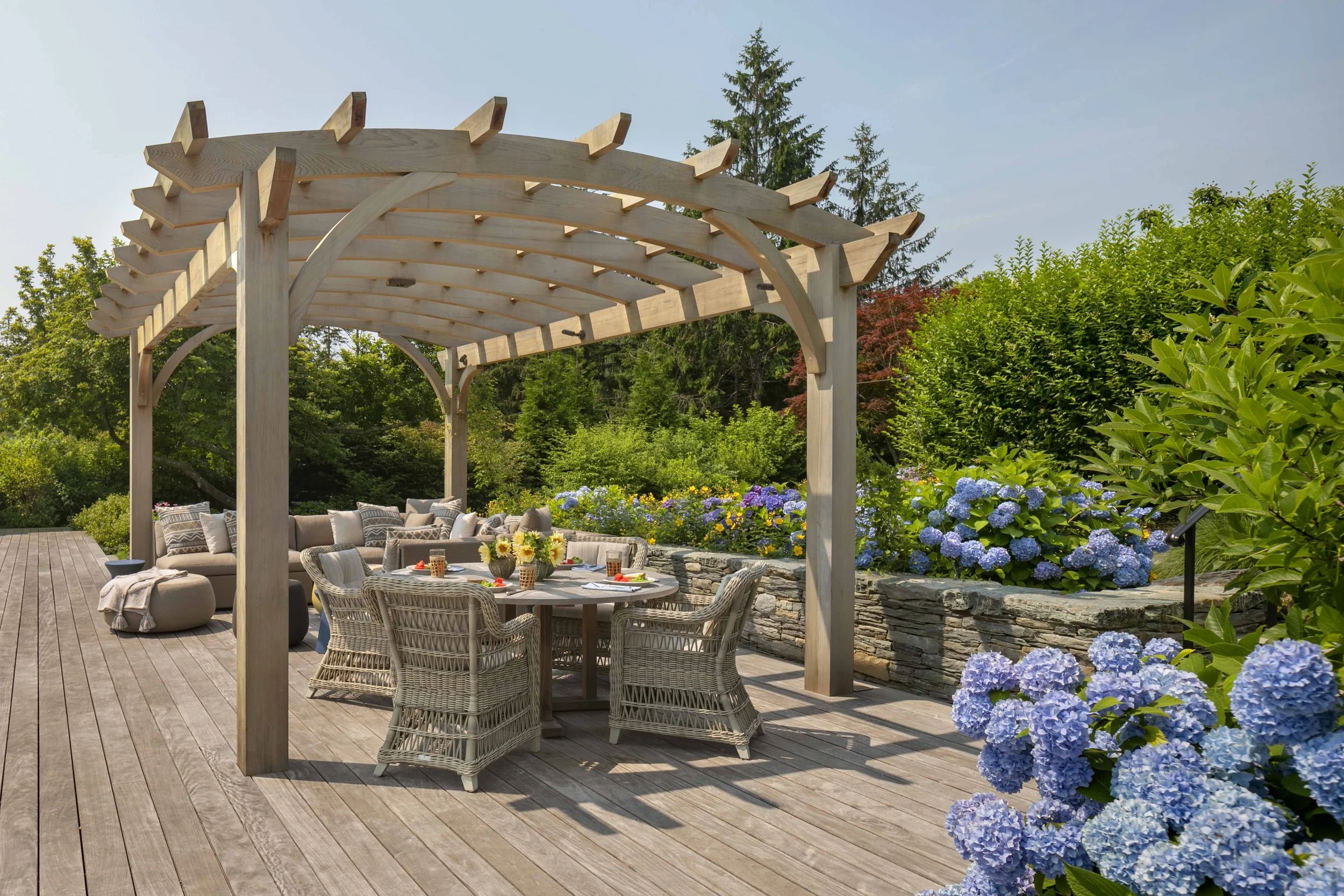 The existing pool was the only major element that was included in the new landscape. Originally a raised concrete structure enclosed within a metal fence, new wood decking brought the surrounding areas flush with the coping, and created a soft, open perimeter with several areas for pool-side relaxation. New pool enclosure fencing was almost completely contained within the planting which provided a direct connection to the lawns and gardens surrounding the pool. A new wood pergola added a sense of enclosure and protection from the sun, as well as soft lighting for the evening hours. A new driveway replaced the former axial circular entry and gave the property more parking. The client’s use of the front porch seemed natural given the farmhouse architecture, but previously was exposed to the street, so the new driveway orientation gave the clients more privacy and a view of a tapestry hedge and garden containing a stone trough fountain and roses.