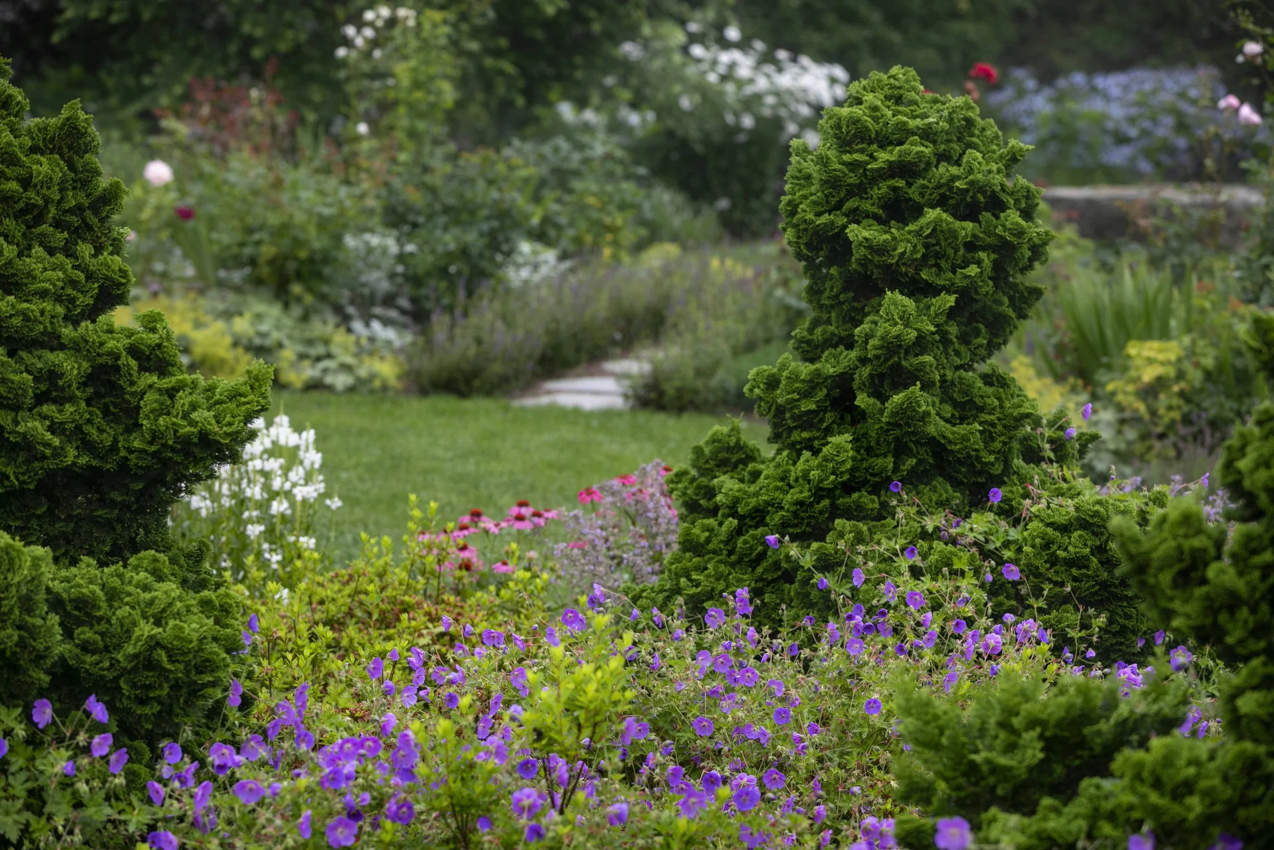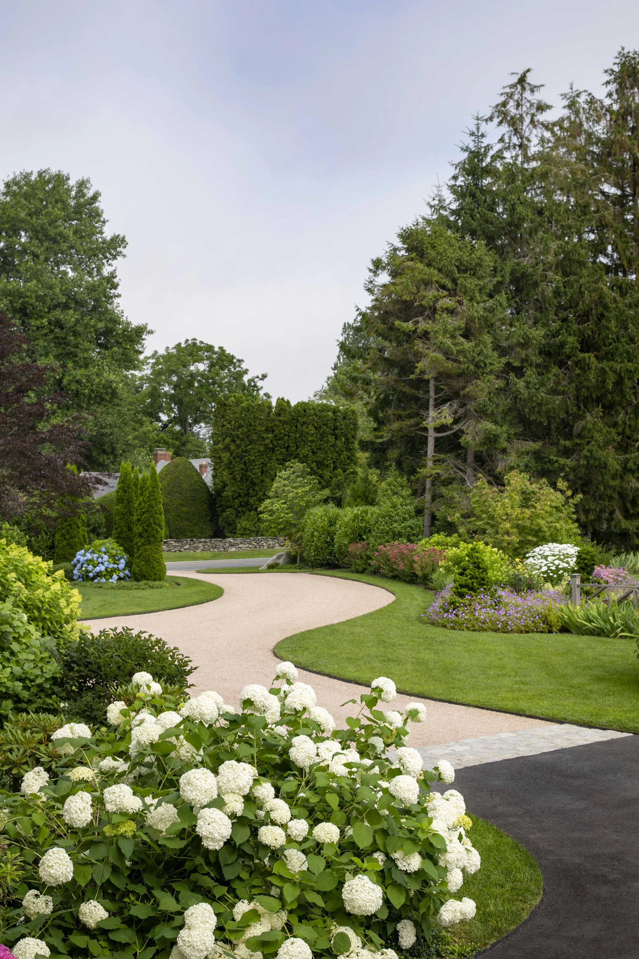 Transplanted material included a large European beech, Japanese maple, weeping cherry, several large arborvitae and dozens of shrubs and perennials. The privet hedge along the street was replaced with a tapestry hedge made up of a mix of native shrubs. The team created an extensive perennial and rose garden for the clients to enjoy across the seasons, and provide a bountiful harvest of cut flowers. This garden consisted of over one thousand individual plants and hundreds of plant varieties. The landscape architect designed the planting beds in shapes that created a river-like lawn flowing towards the stream. Each group of plants was laid out by hand and thoughtfully placed to ensure three seasons of bloom and a balanced color palette. Inspired by the history of artists, the perennial garden is like a dynamic, living painting, changing from one moment to the next. It is located in an ideal spot for sun and afternoon shade, and adjacent to the vegetable garden so that both clients could be in their gardens – separate but connected.