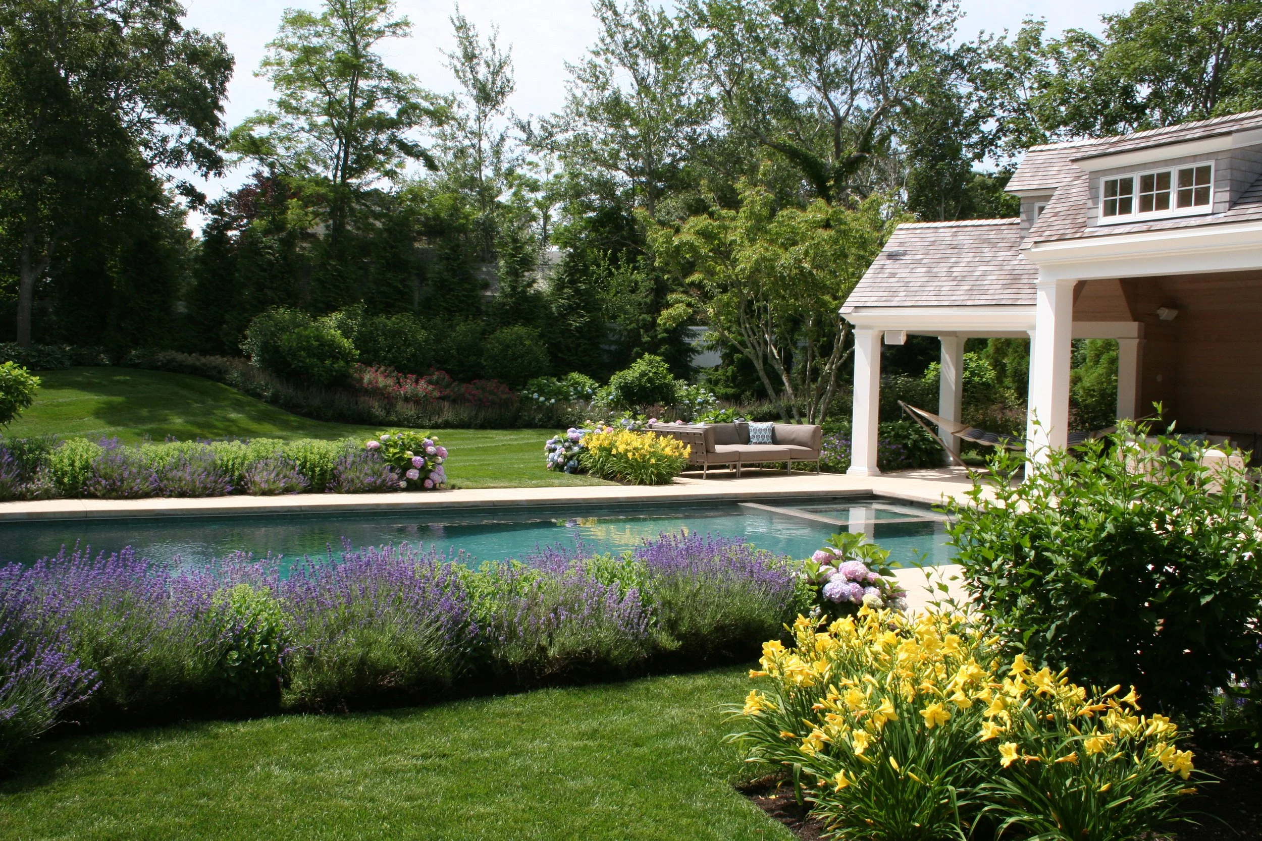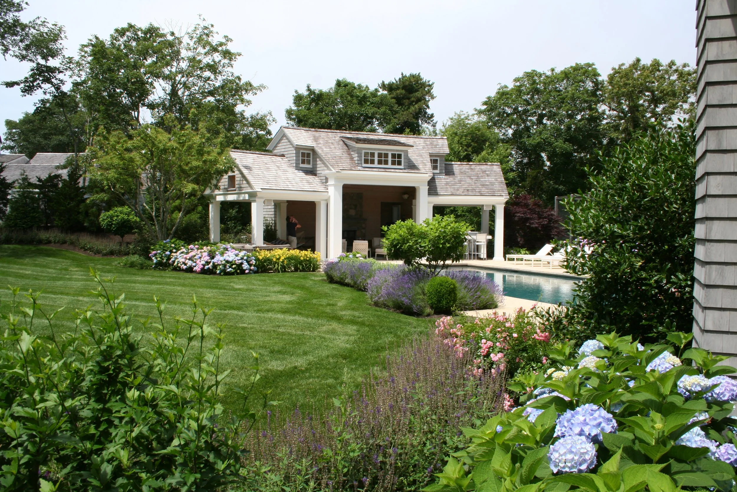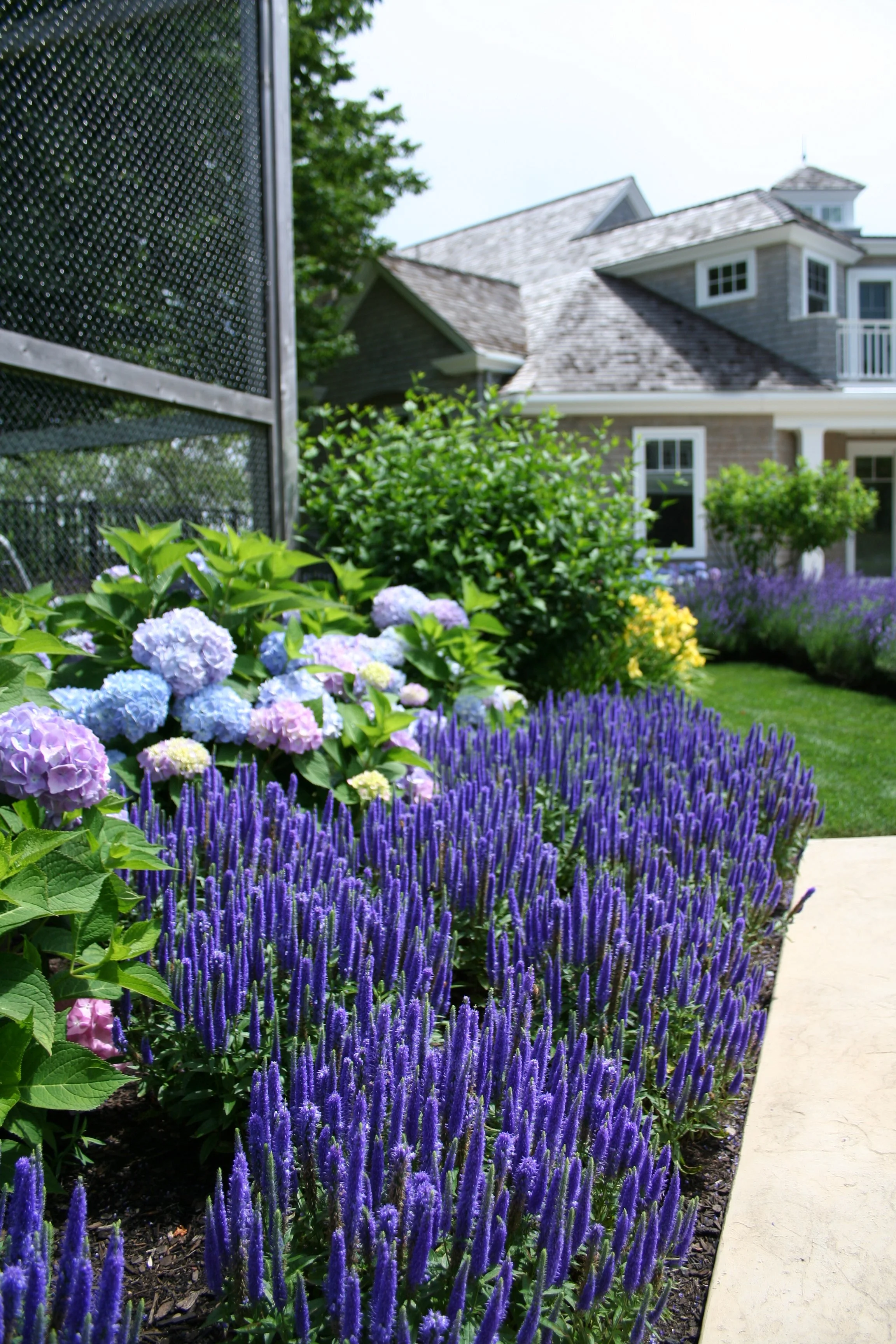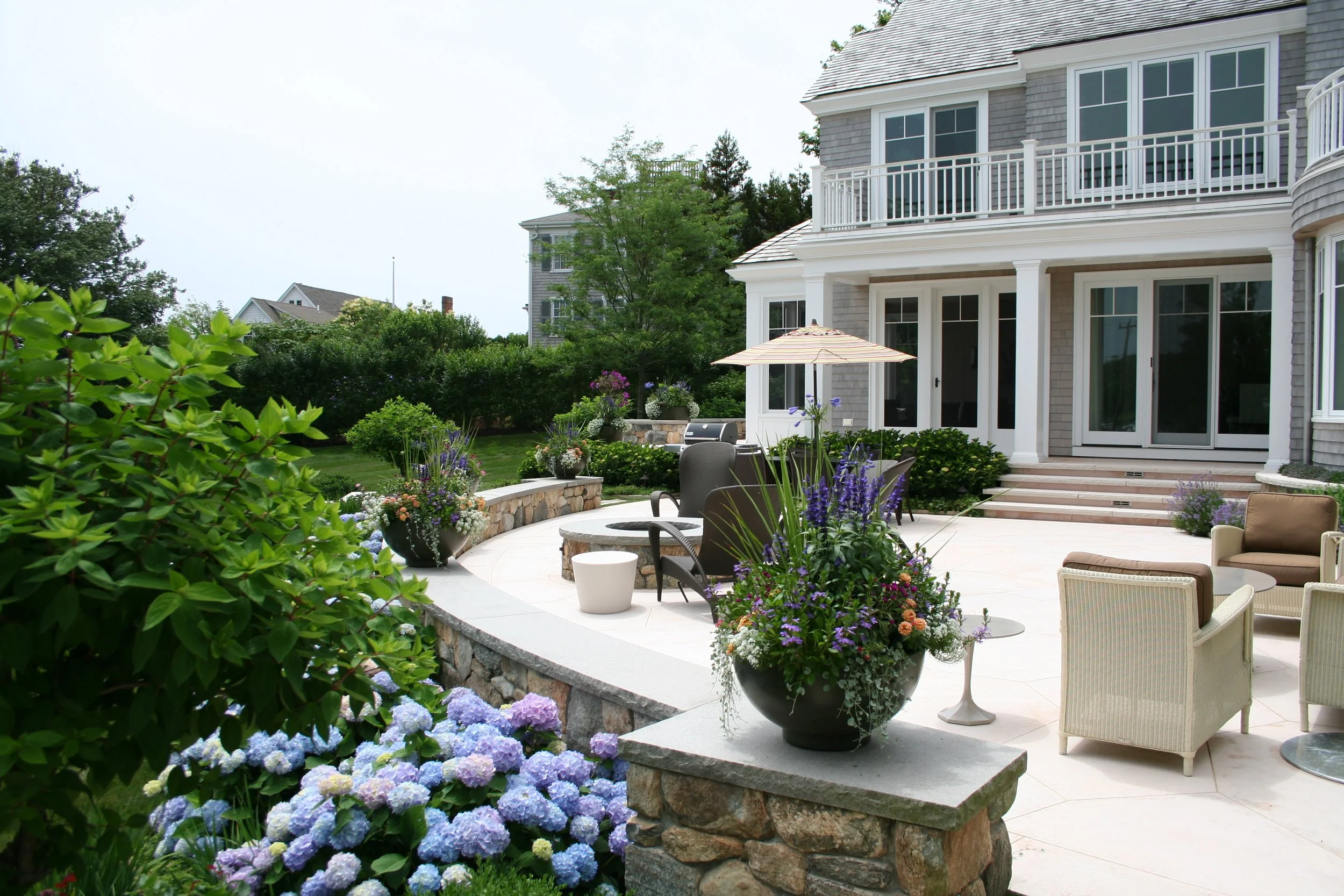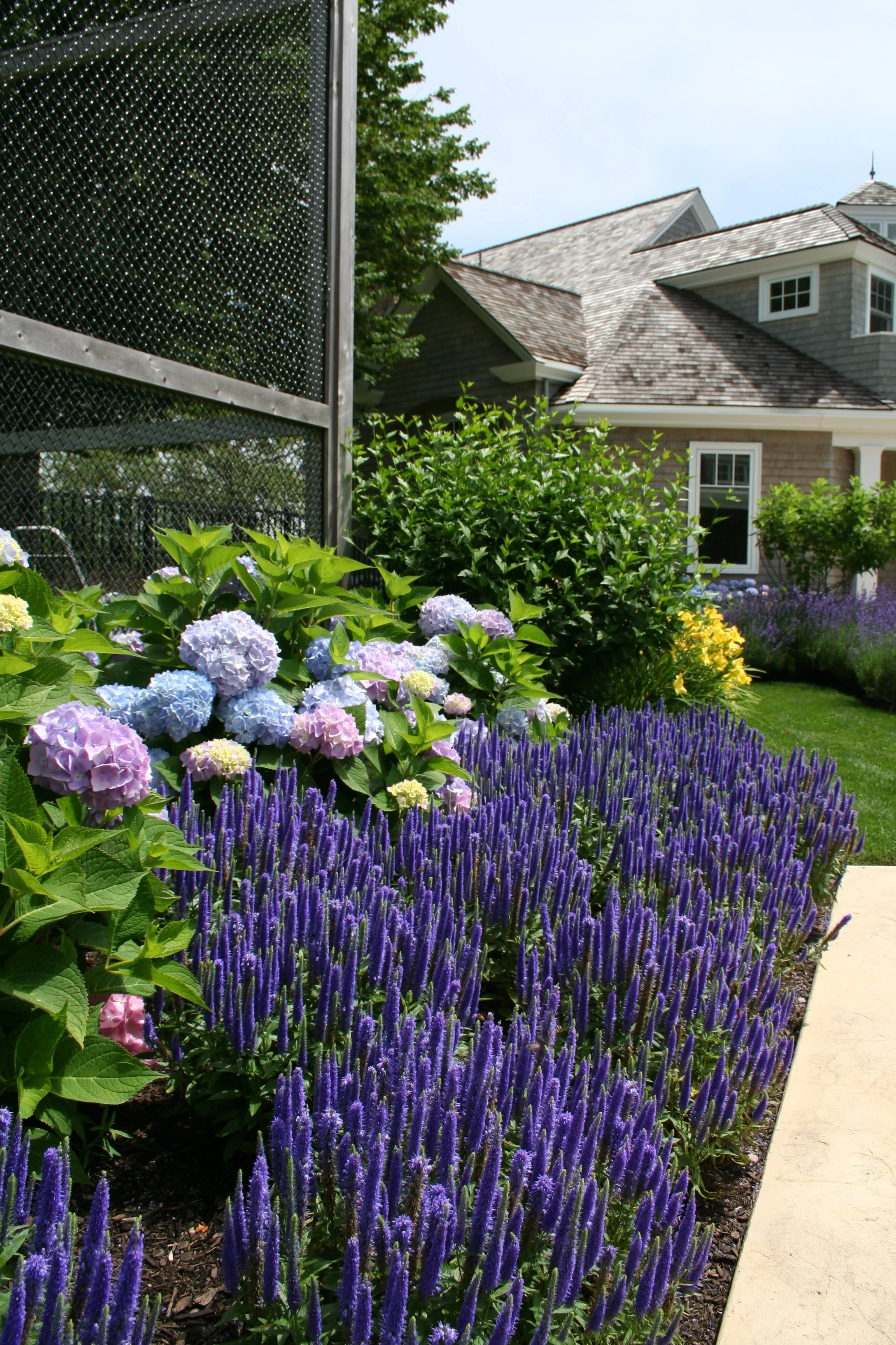 Planting includes native shrub borders of clethra, arrowwood, silky dogwood, enkianthus, inkberry, red cedar, and sweetspire. Colorful plants around the house were selected for continuous bloom and interest.