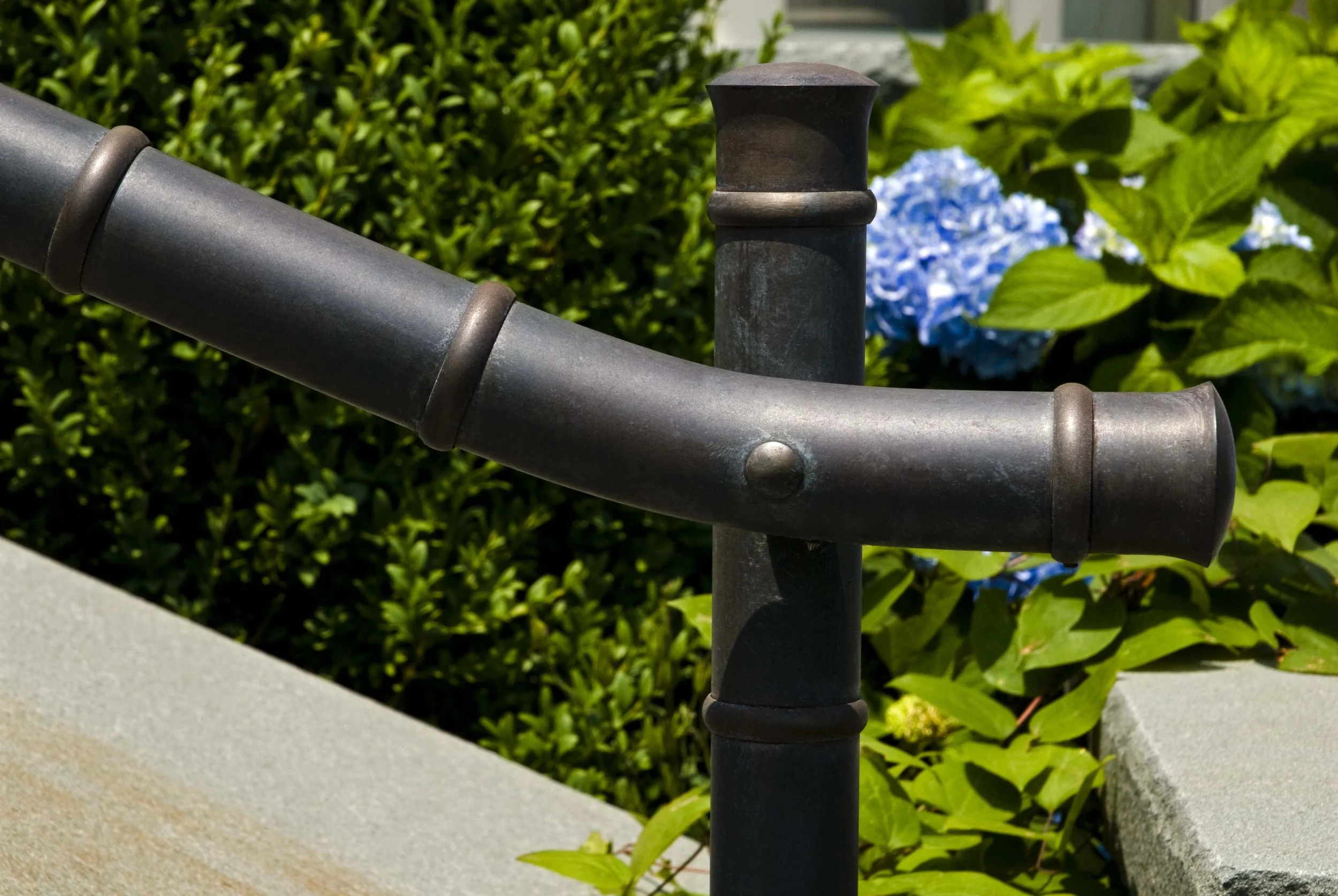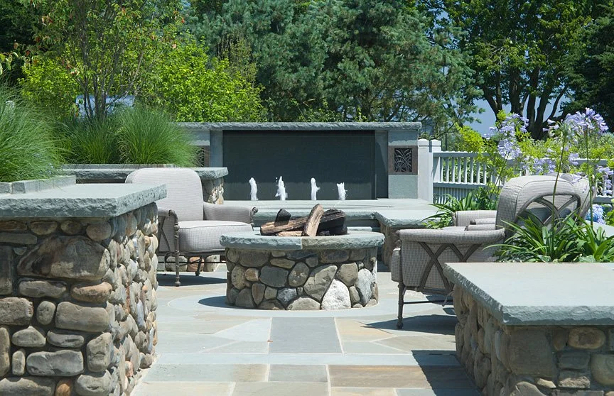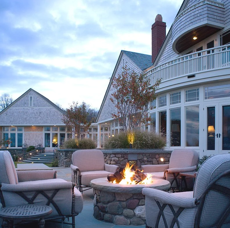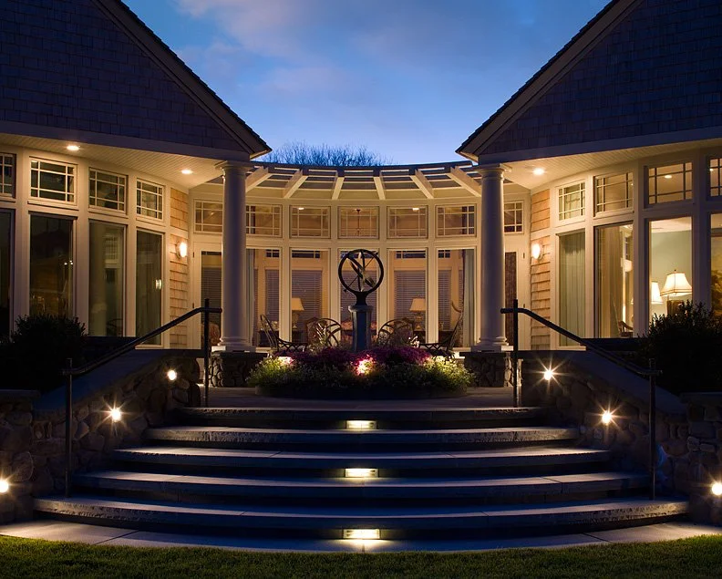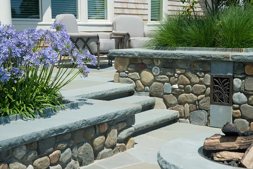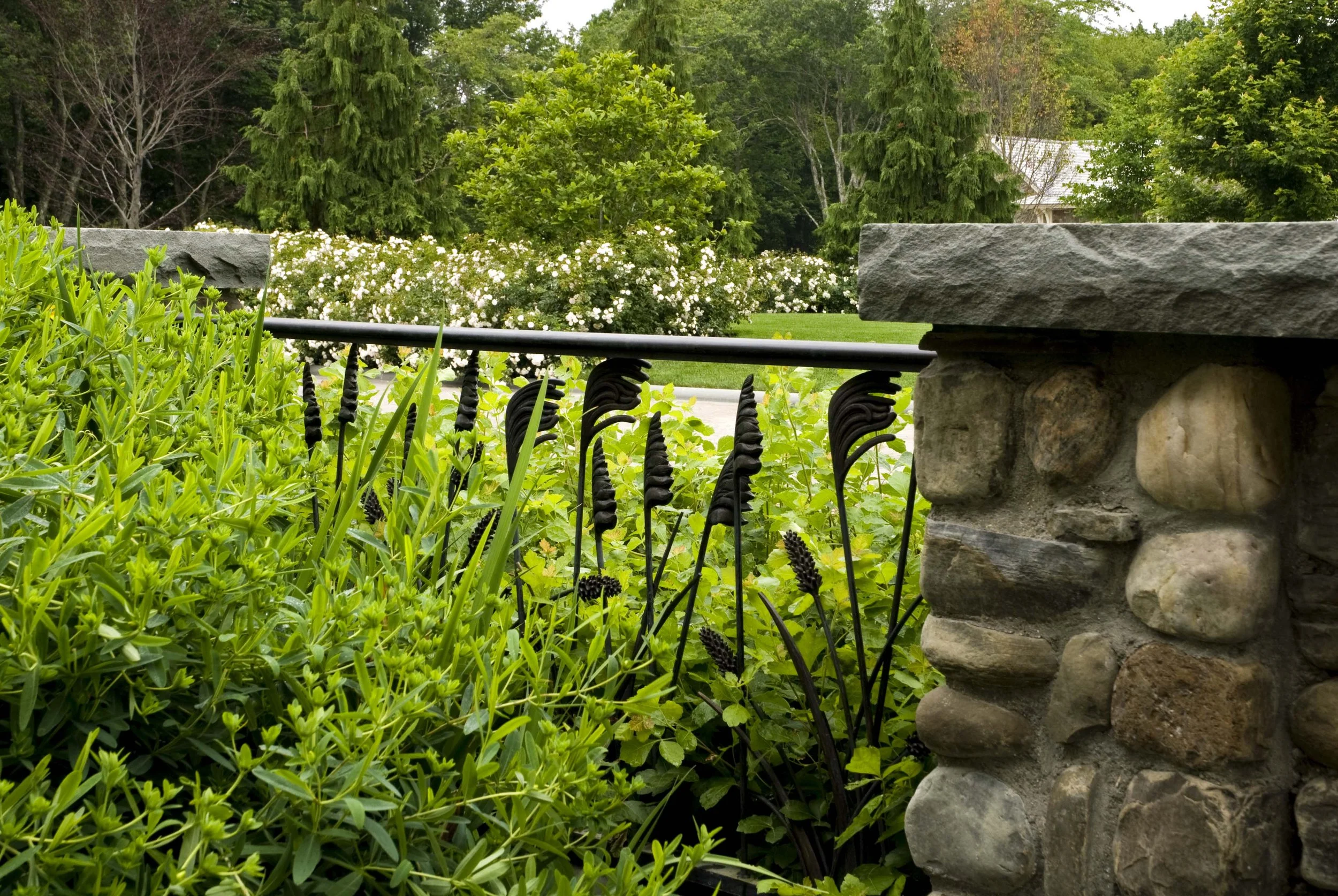 The eastern part of the site contains open conservation fields that became a major inspiration for the detailing of stone, bronze and wood elements throughout the property. Existing native and ornamental grasses influenced the custom features which include the bronze speaker grill covers, bronze and wood fencing, fence latches, handrails and a cradle for the spa cover. The bronze grass inflorescence and leaves appear to be tilting in the wind, an artistic nod to the seashore location. The grass theme expands to include a bamboo design for the stone base of the armillary sphere and the custom handrails. Mosaic paving patterns at the armillary sphere and spa terrace pay homage to the fractures in the native ledge outcropping at the shoreline. Wooden gates and fence enclosure incorporate the natural themes and provide needed containment for the client’s dogs.