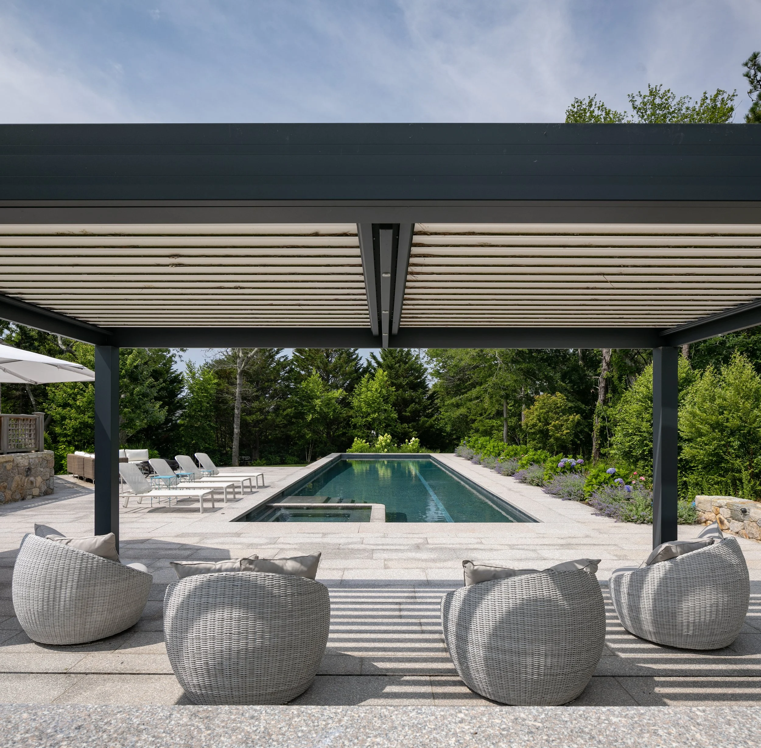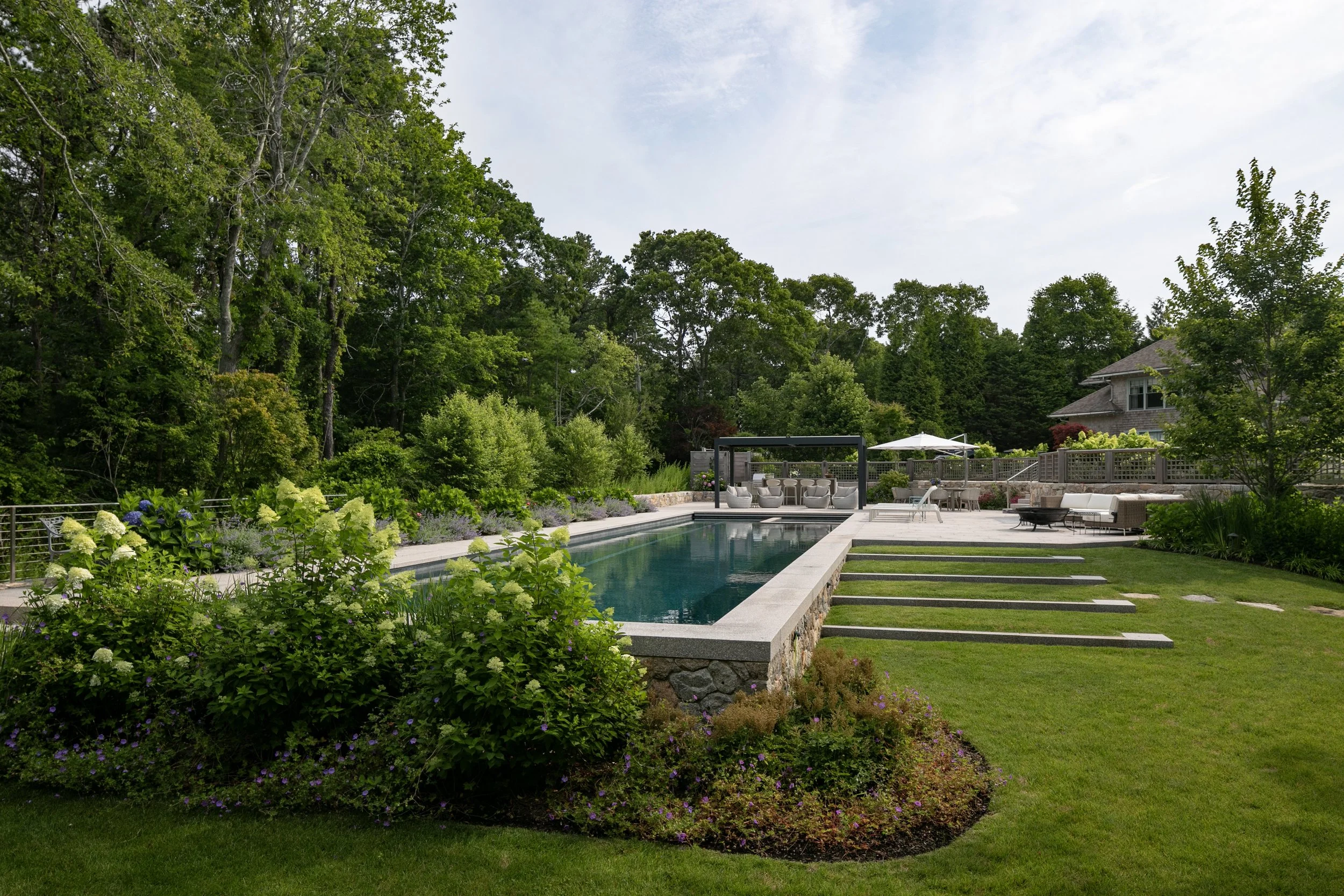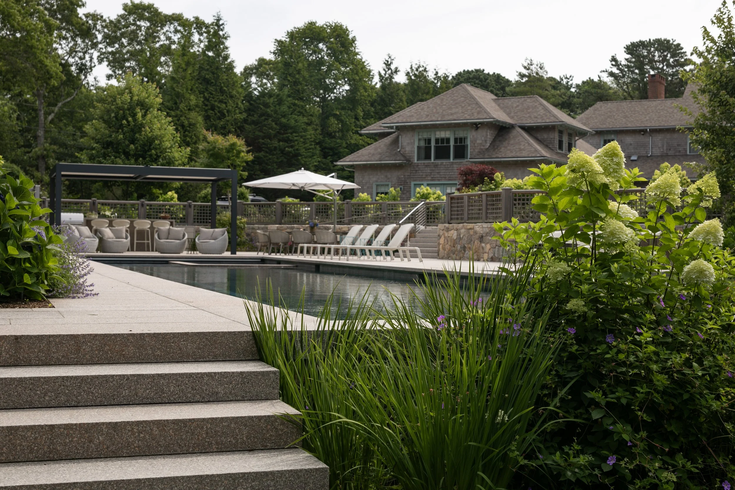 The shingle style home was purchased as a family retreat to gather together in the summer time. It was set to undergo major renovations, which included the siting of a new detached 3-car garage with a home office and gym above. As a part of the upgrades the clients wanted to add a 75’ long swimming pool, outdoor kitchen, pergola, outdoor shower and upgraded circulation and planting. The main challenge was finding a discrete location on the site to accommodate a pool of that size, while also limiting the disturbance to existing plant material and meeting setback requirements – both from the septic and property lines.