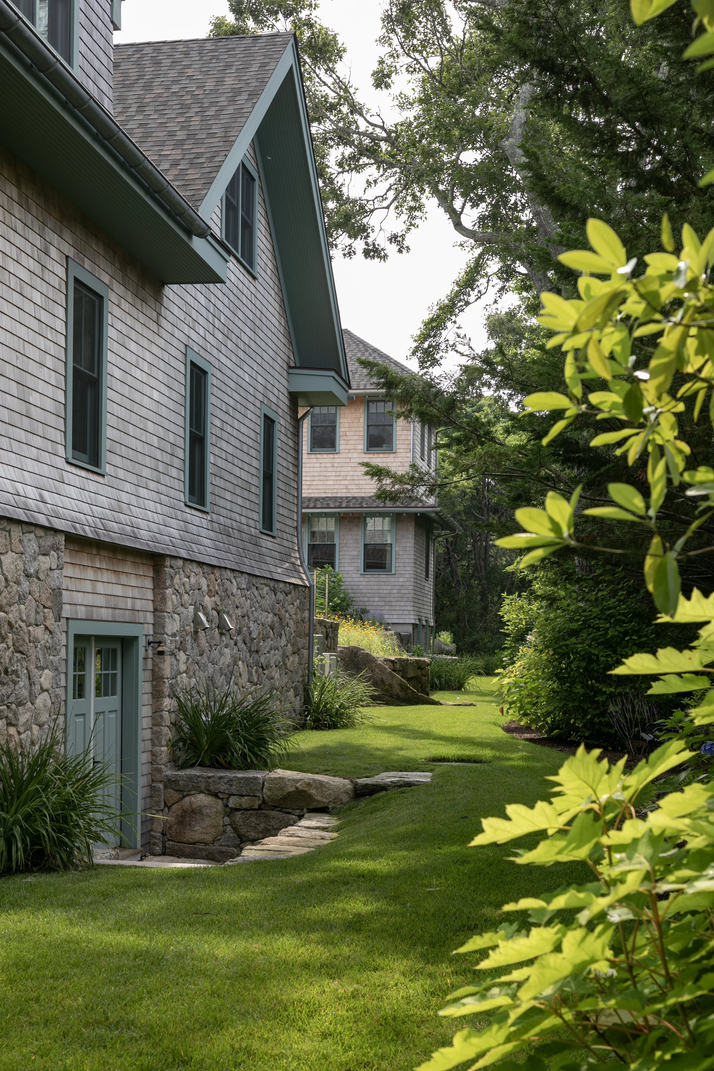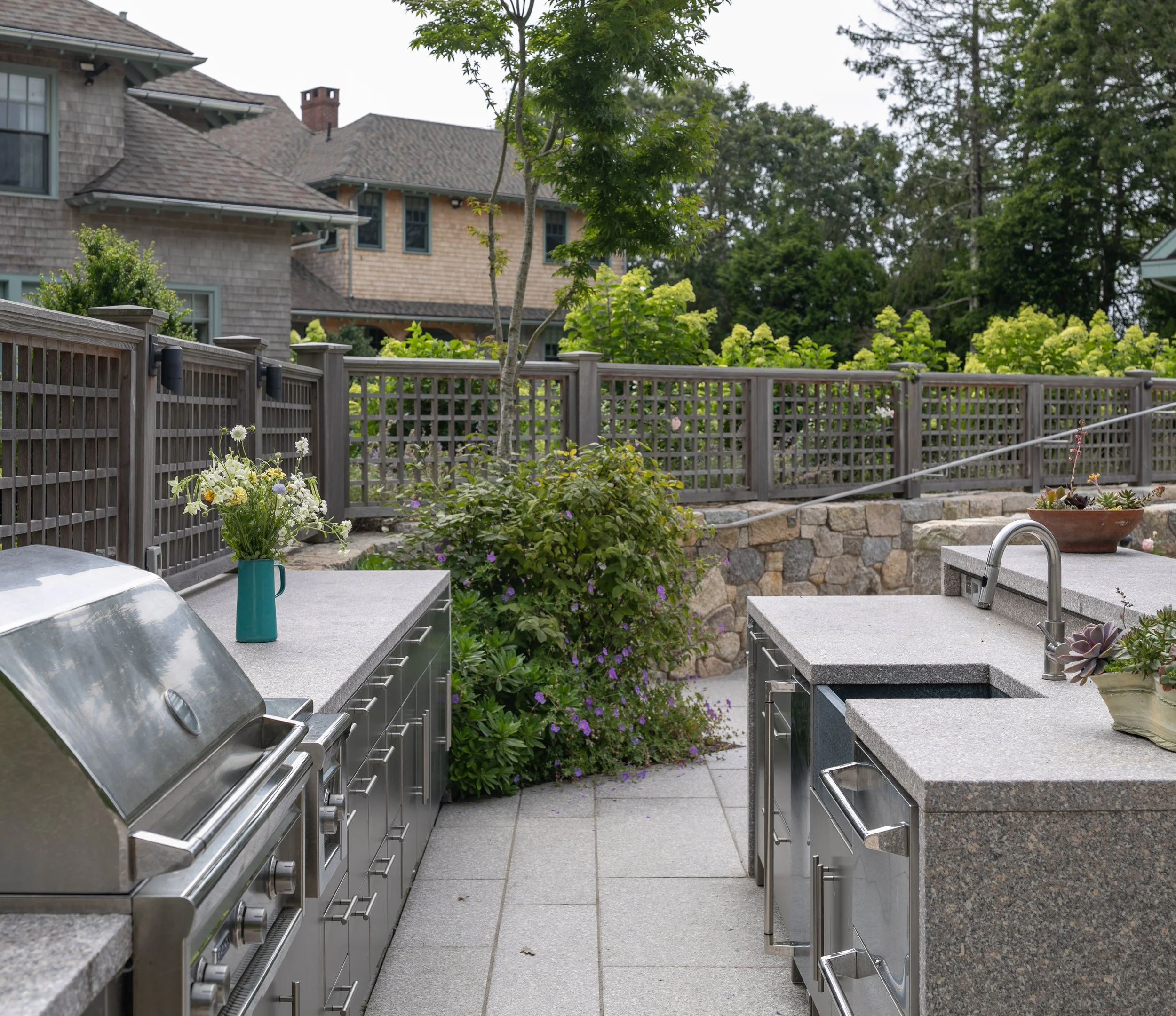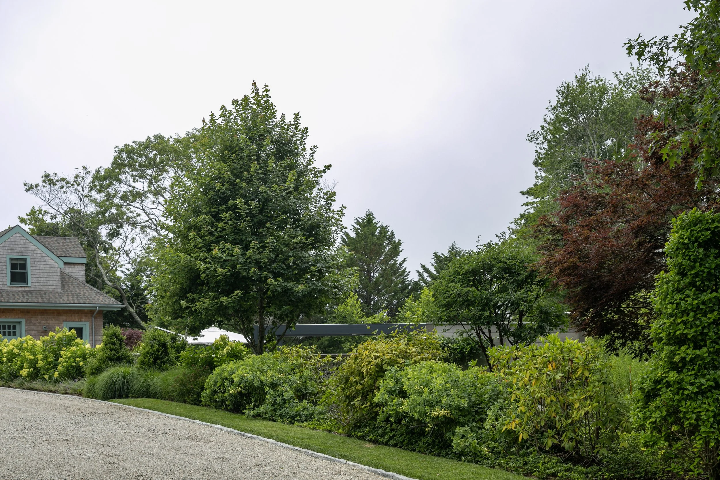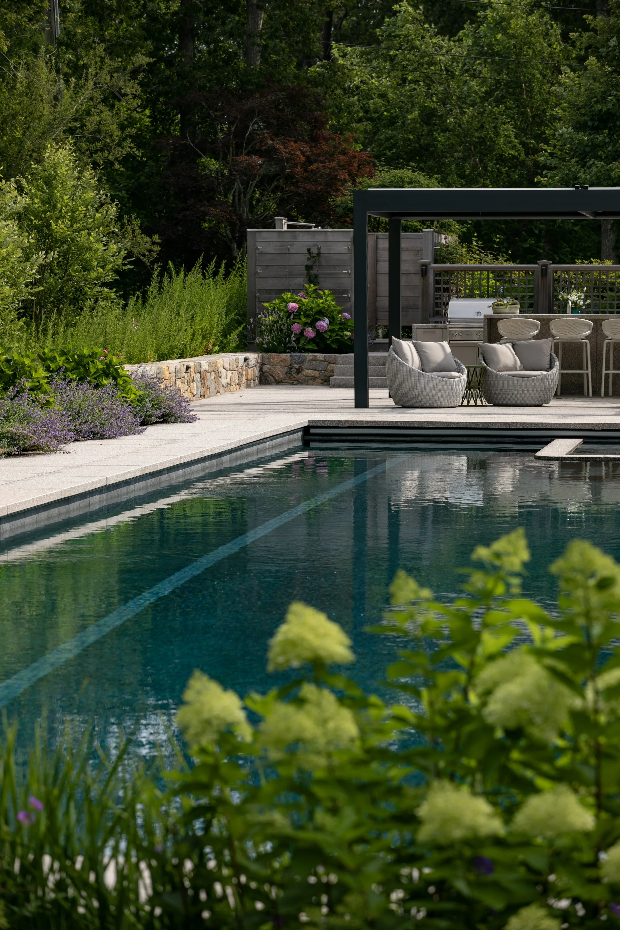 The shingle style home was purchased as a family retreat to gather together in the summer time. It was set to undergo major renovations, which included the siting of a new detached 3-car garage with a home office and gym above. As a part of the upgrades the clients wanted to add a 75’ long swimming pool, outdoor kitchen, pergola, outdoor shower and upgraded circulation and planting. The main challenge was finding a discrete location on the site to accommodate a pool of that size, while also limiting the disturbance to existing plant material and meeting setback requirements – both from the septic and property lines.