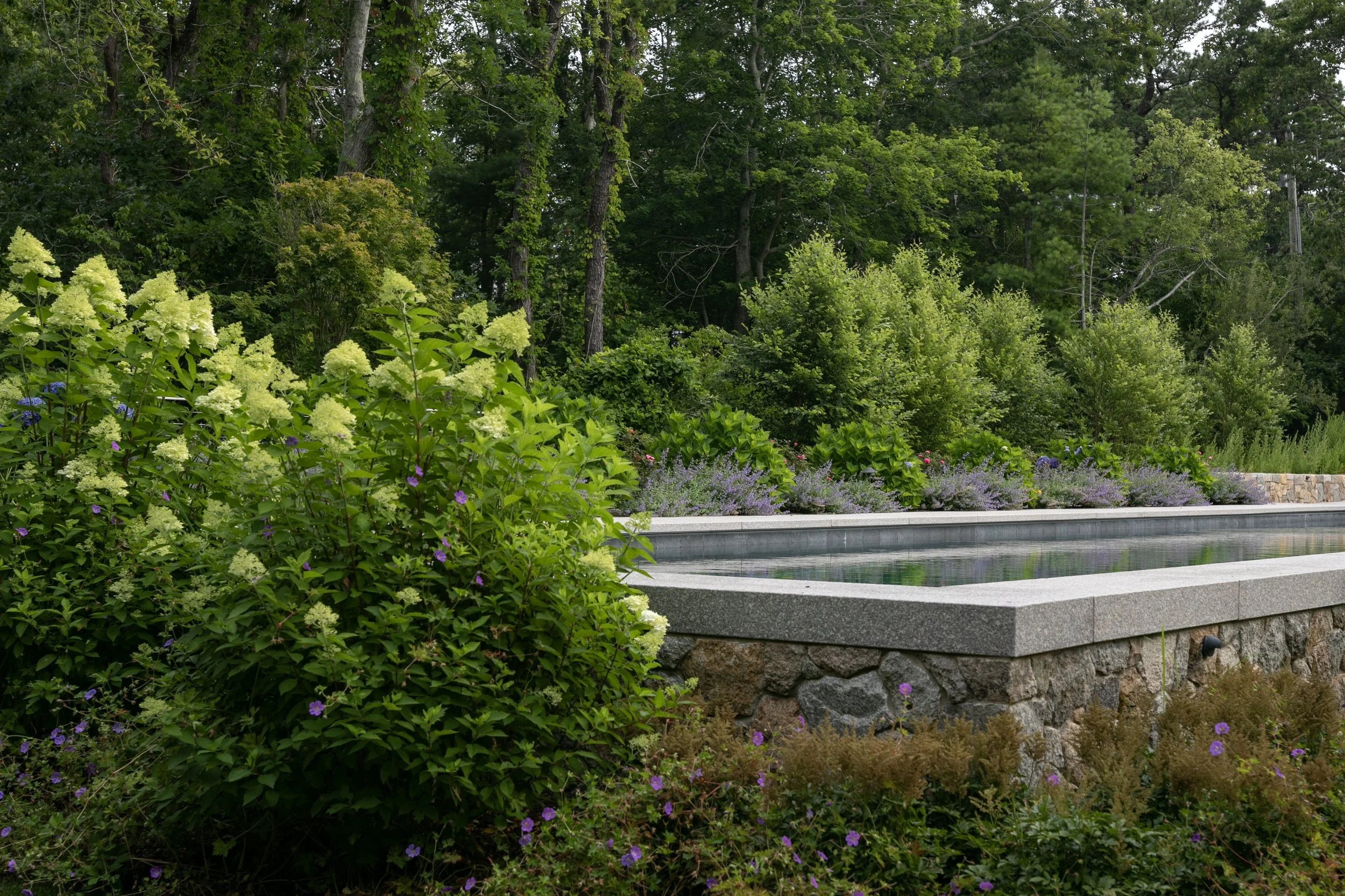 Once the terrace was completed much care was taken to integrate the large terrace and pool back into the natural surrounds. This meant softening the edges of the hardscape with garden borders, native plant material and replanting native woodland edges. One family member was an avid gardener but traditional gardens and gardening were limited by shade and a need to create a property border that screened the surrounding roads and neighbors, so small pocket gardens were tucked into special spaces, like between boulder walls and even in an herb garden inside a sentimental family canoe. Restoring a woodland’s edge had the challenges of existing canopies and roots, narrow spaces and the removal of invasives along the neighboring property. Plant material was selected for the suitability, native status and beauty. We created gardens at the woodlands edges and located paths along these gardens so that the details could appreciated up close. All of this added plant material, coupled with the change in grade, disguises the pool terrace from the road and creates a calming natural envelope for a beautiful family retreat.