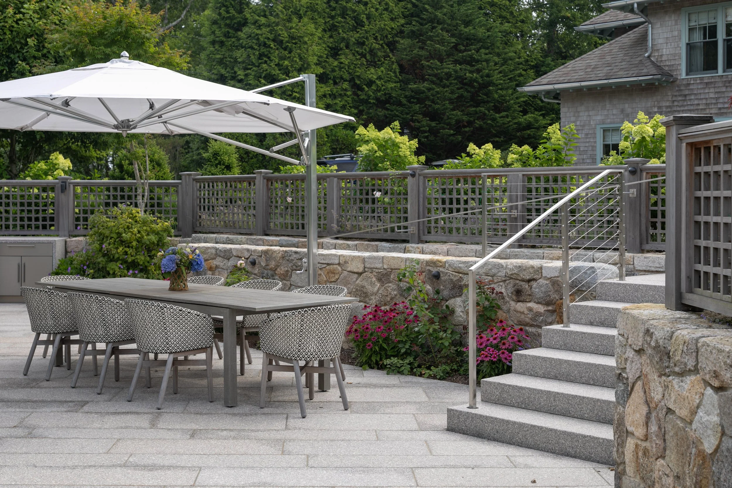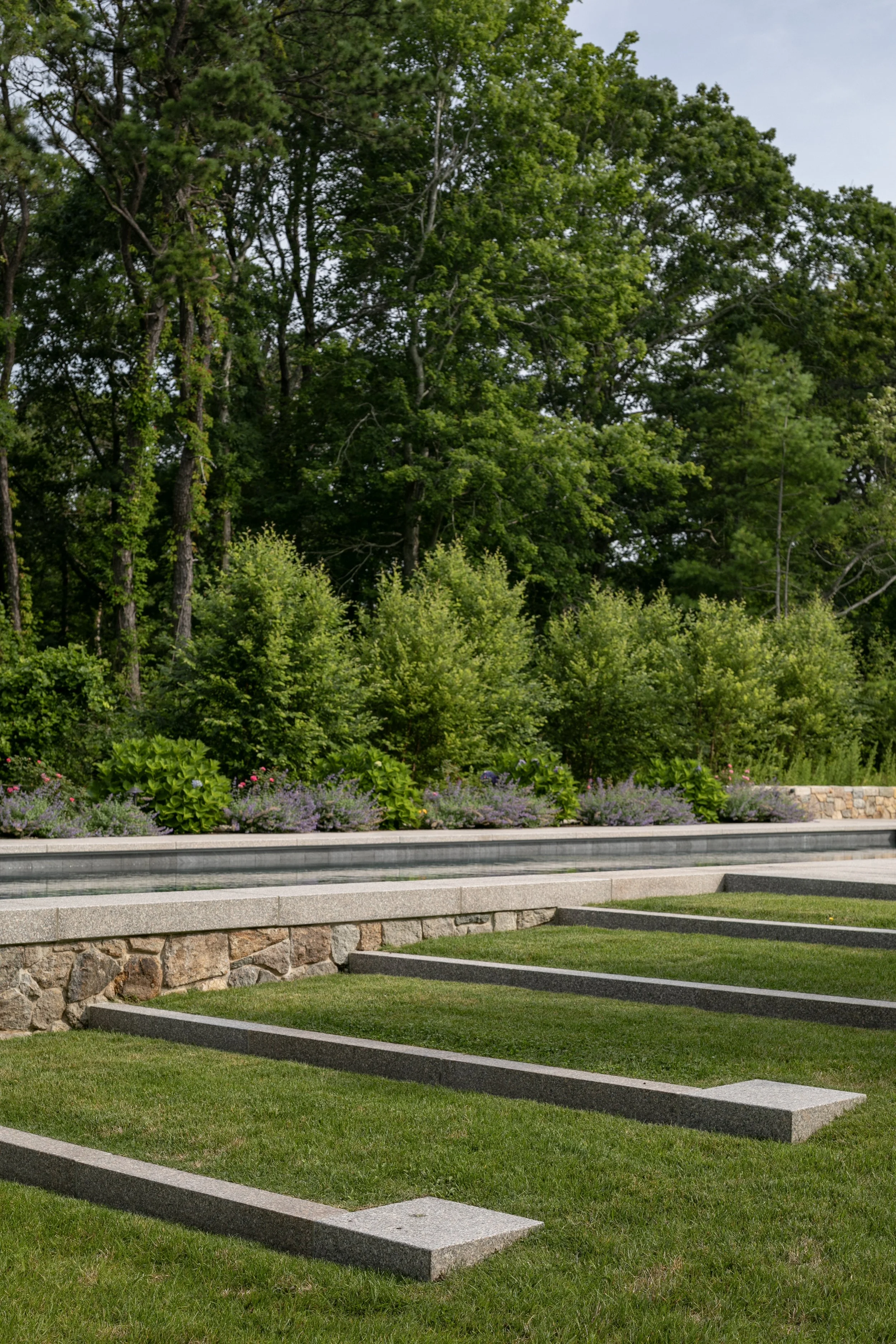 The location of the pool terrace was a significant grade change from the main house and with an eye towards the needs of assisted circulation, both for aging family members as well as younger generations with growing families, accessibility was key. We used monolithic granite steps from the garage motor court as well as a granite ramp to allow for multi-module access to the pool terrace.
